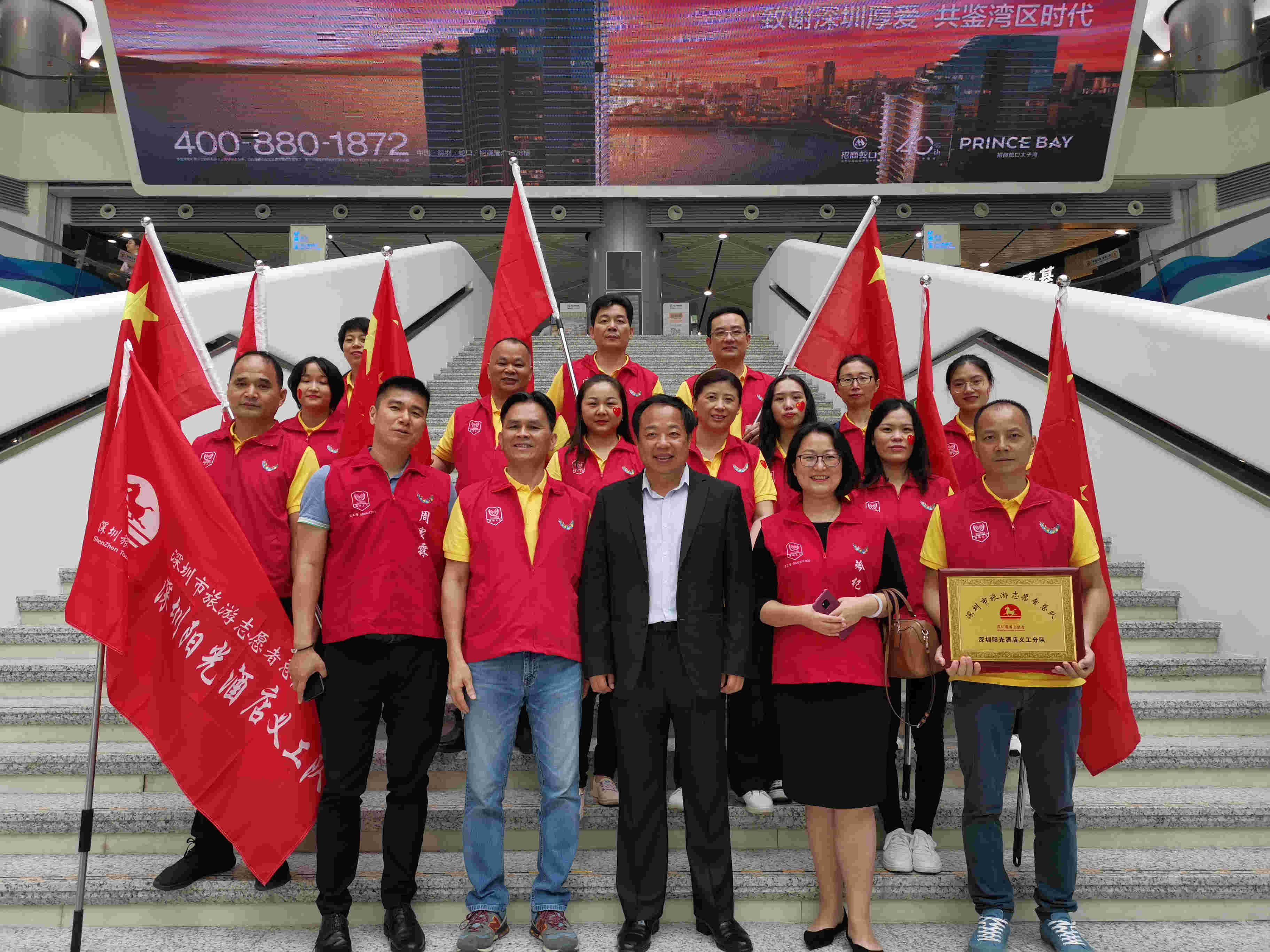 在深圳市文化廣電旅遊體育局、市旅遊協會的號召下,400多名旅遊志願者齊聚一堂,與現場數千名遊客共同行動,“把文明旅遊帶出去”,為祖國獻禮慶生。旅遊志願者們在這裏向出國遊玩的旅客傳遞文明旅遊的觀念與準則,在這裏見證十支旅遊志願者分隊的誕生、見證深圳旅遊志願者突破一萬人的歷史時刻,在這裏用滿腔熱血歌唱對祖國的愛。用獨特的方式演繹一曲《我和我的祖國》。