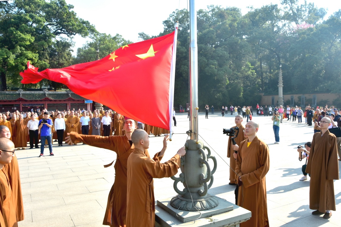 在雄壯的國歌聲中,南華禪寺僧人將鮮艷的五星紅旗冉冉升上藍天(梁國勁攝影)