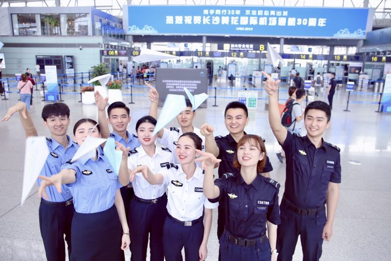 截至2018年,長沙黃花機場已開通國內航線216條,國際及地區航線44條。圖為長沙機場通航30周年紀念日上,工作人員將手中的「紙飛機」飛向四面八方,寓意把美好的祝福傳遞給來自世界各地的旅客