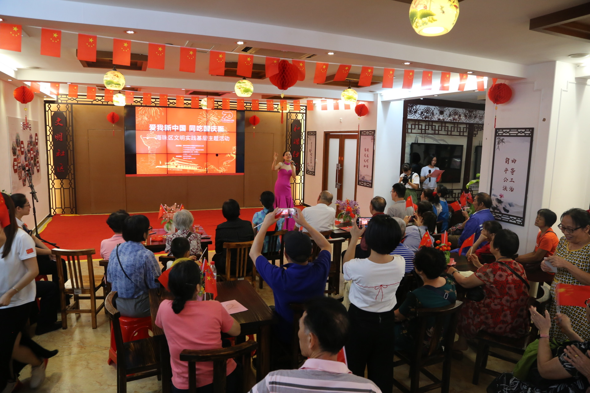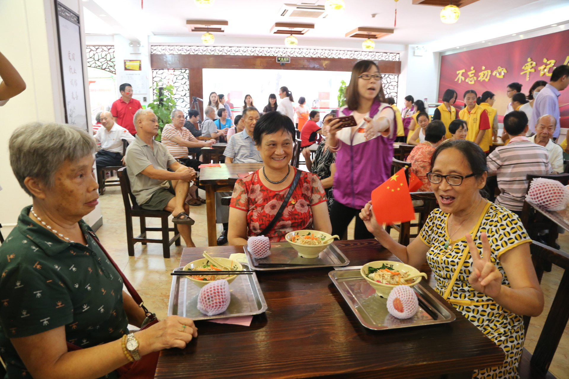 活動負責人表示:今天我們共聚一堂觀看首都,同慶祖國70周年華誕,衷心感謝各位到場人士。回顧歷史,我們心潮澎湃,展望未來,我們攜手共進,同心同意,共賀我們祖國更加繁榮昌盛!這次同吃國慶面的活動主要有兩個目的,一是用這種特別的方式慶祝中華人民共和國成立70周年,與長者共慶祖國華誕、共享民族榮光;二是希望通過一碗熱氣騰騰的長壽麵,讓長者感受到社會濃濃的敬老情,也向社會弘揚愛老敬老的傳統美德。