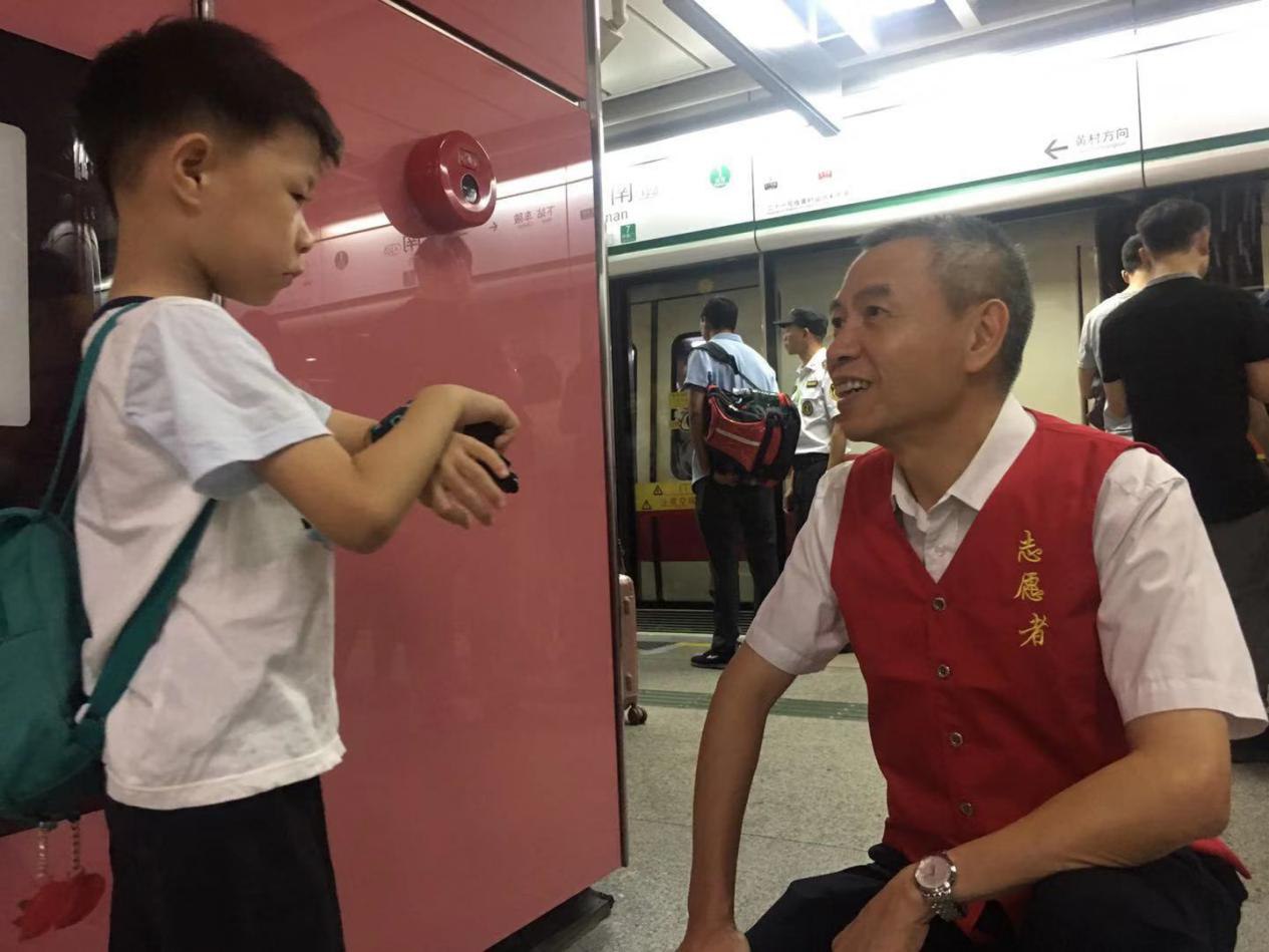 此時,廣州地鐵集團黨委副書記莫東成正好也在車陂南站參與大客流引導。得知情況後,身着紅色志願者馬甲的他來到小男孩身邊,輕輕蹲下,微笑着安撫小男孩的情緒:「你多大啦?今天誰帶你來坐地鐵的呀?」……在他的安撫下,小男孩慢慢放下戒心,停止了哭泣,話也漸漸多起來。