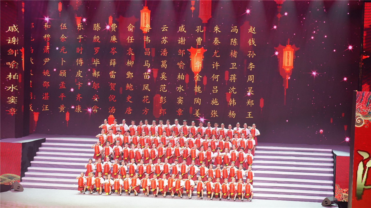 「趙錢孫李周吳鄭王……」生而為人,首先有姓。姓氏文化,牽動着每一位華夏子孫的根脈。舞台上,一群稚氣十足的孩子,有的踏步拍掌,有的蹦跳扭腰,或領唱領讀或互答應和,用載歌載舞的表演,將童謠吟唱《百家姓里有根脈》演繹得童趣滿滿。稚嫩的童聲傳誦經典,悅耳的童謠抒發心聲,純凈如天籟的聲音引來滿堂喝彩。