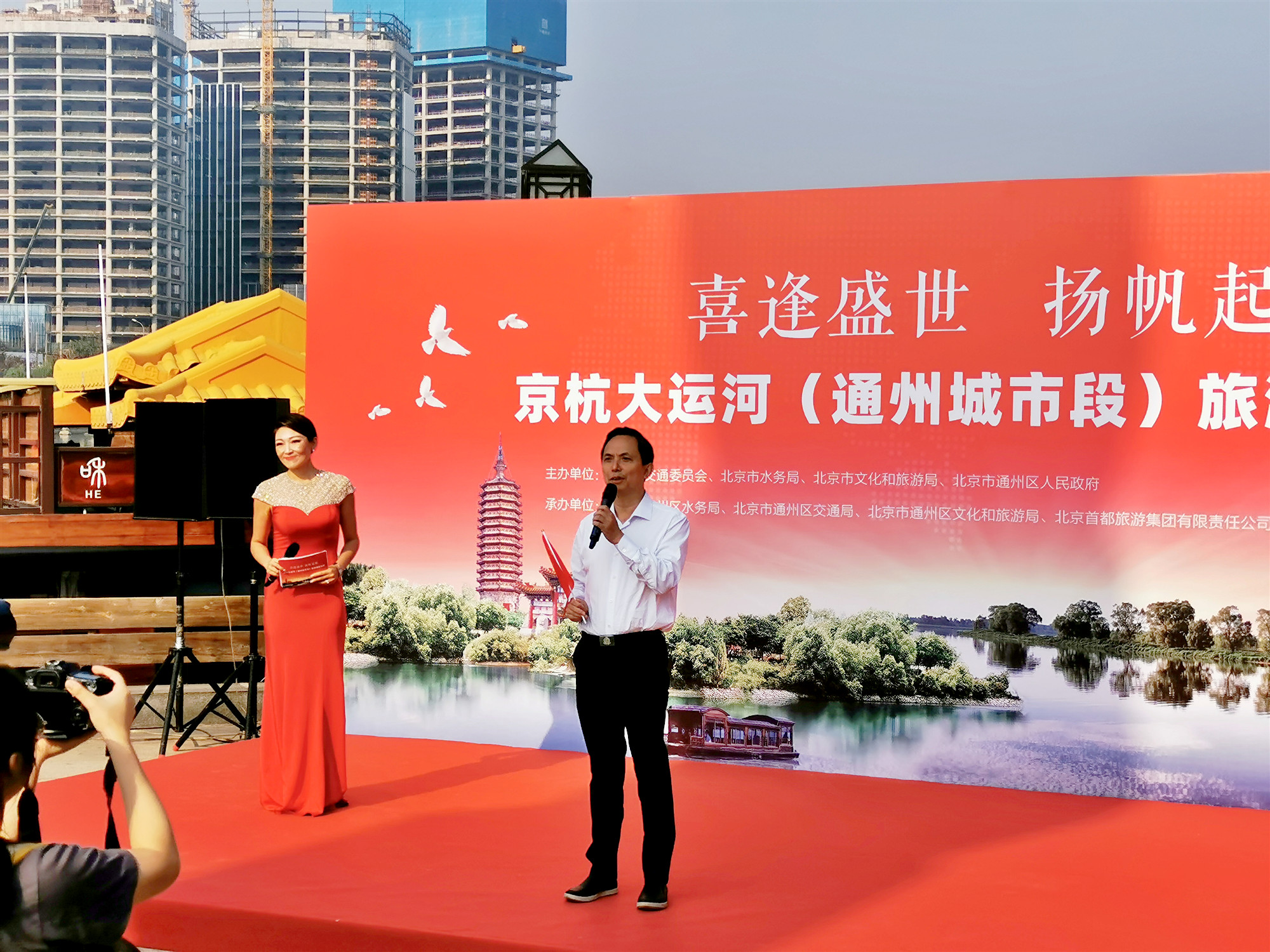 京杭大運河通州區城市段通航儀式現場,通州區區委書記曾贊榮做通航致辭