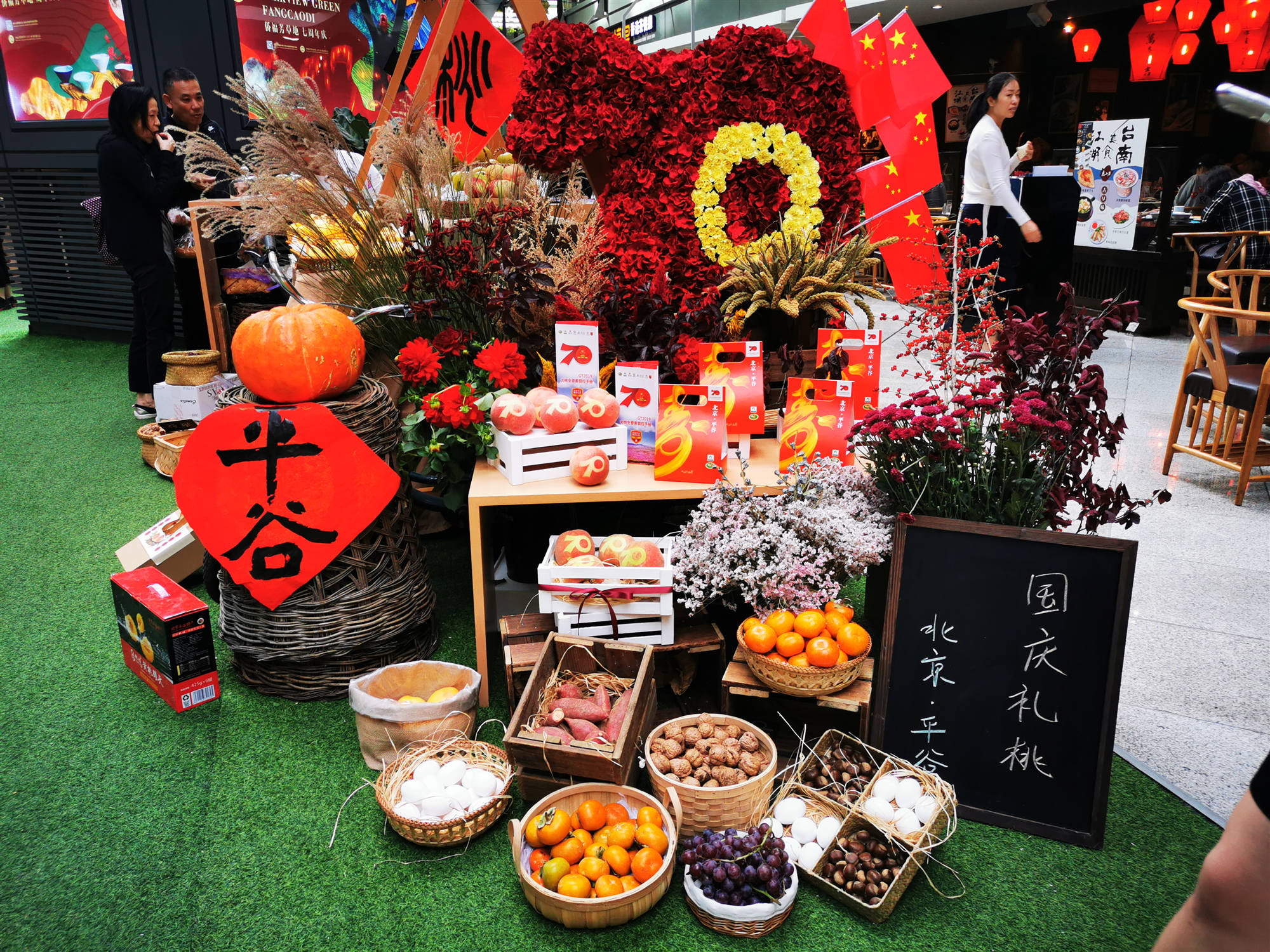 金秋時節,除了平谷的大桃,來自平谷區各鄉鎮出產的當季秋梨、蜜棗、小米、栗子、鮮核桃、南瓜、柴雞蛋等農副產品,以及桃木雕刻、天然奇石、小提琴等文化產品,也出現了僑福芳草地平谷桃源周末集市上,平谷籍書法家馬乾、劉建豐,在現場為市民寫福字,為祖國獻上祝福。充滿歡笑的市集,以豐收為主題,精心組成了一幅色彩斑斕的喜慶圖案「70周年」,與全國人民祝福祖國、共慶豐年、分享喜悅。