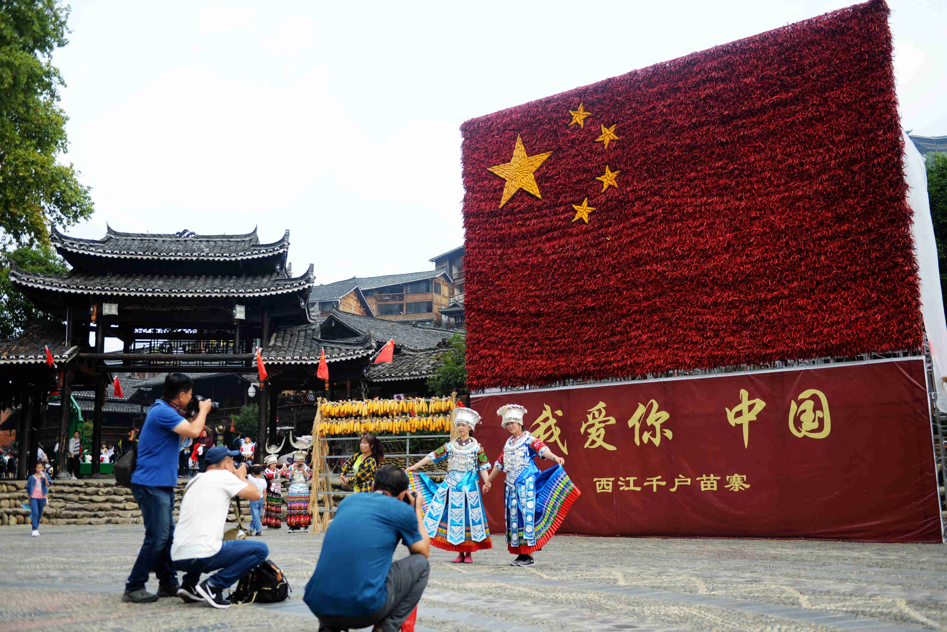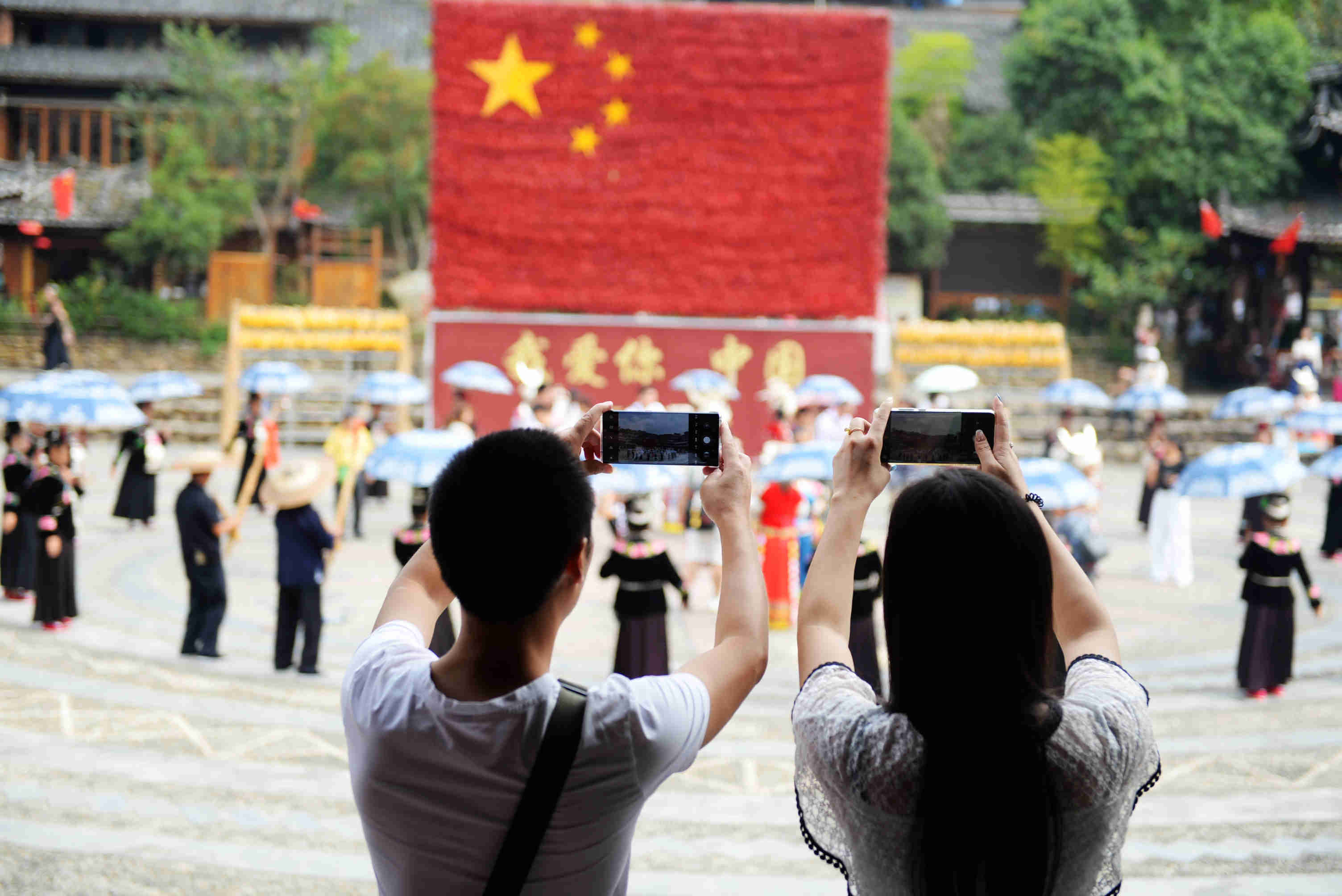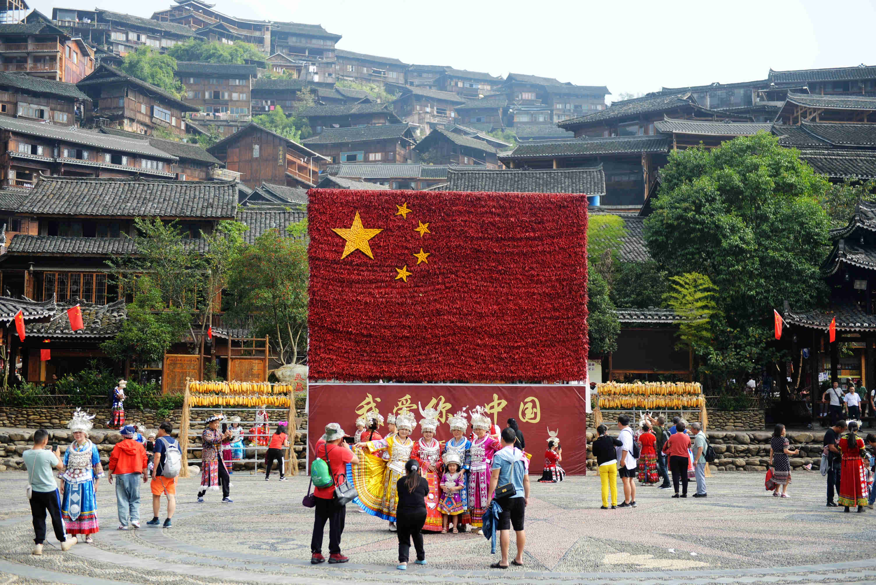 【香港商報網訊】「十一」黃金周期間,貴州雷山西江千戶苗寨內的中心蘆笙廣場上一幅巨大的國旗頻頻亮相,吸引前來的省內外遊客紛紛走到紅旗下拍照留影,祝福對祖國的繁榮富強、人民生活紅紅火火。