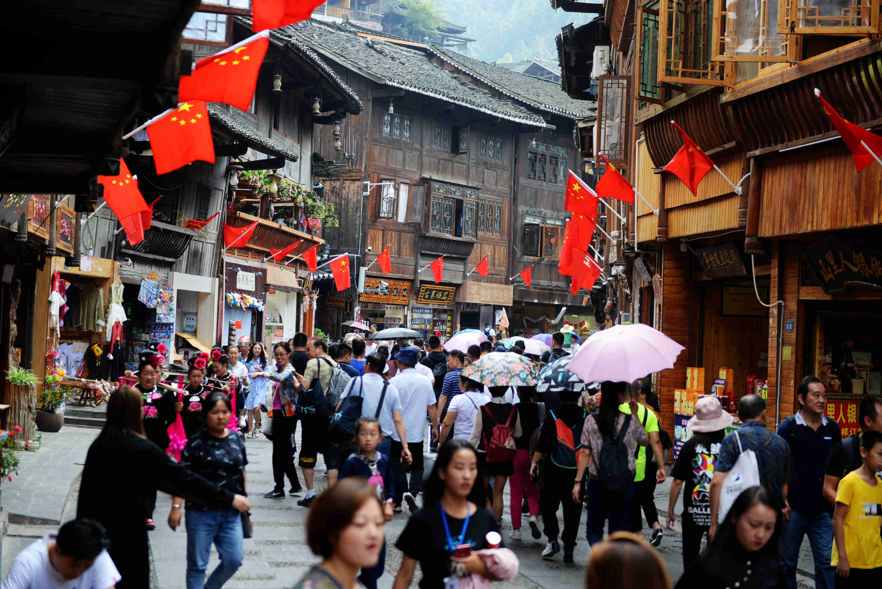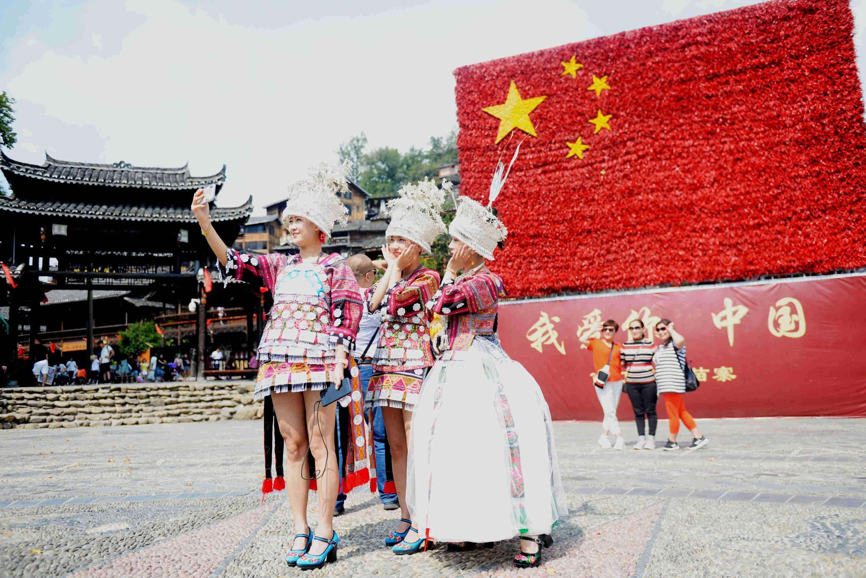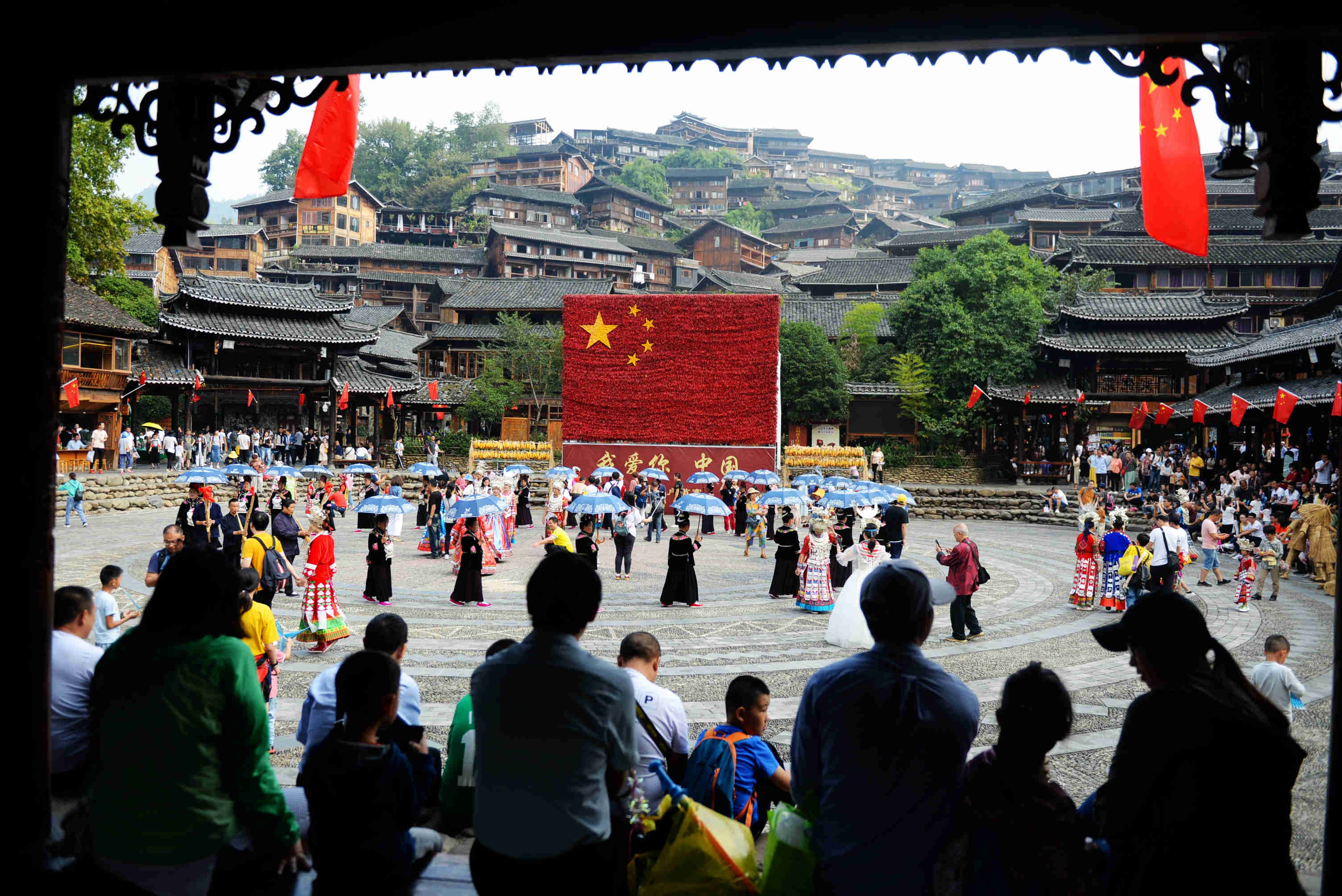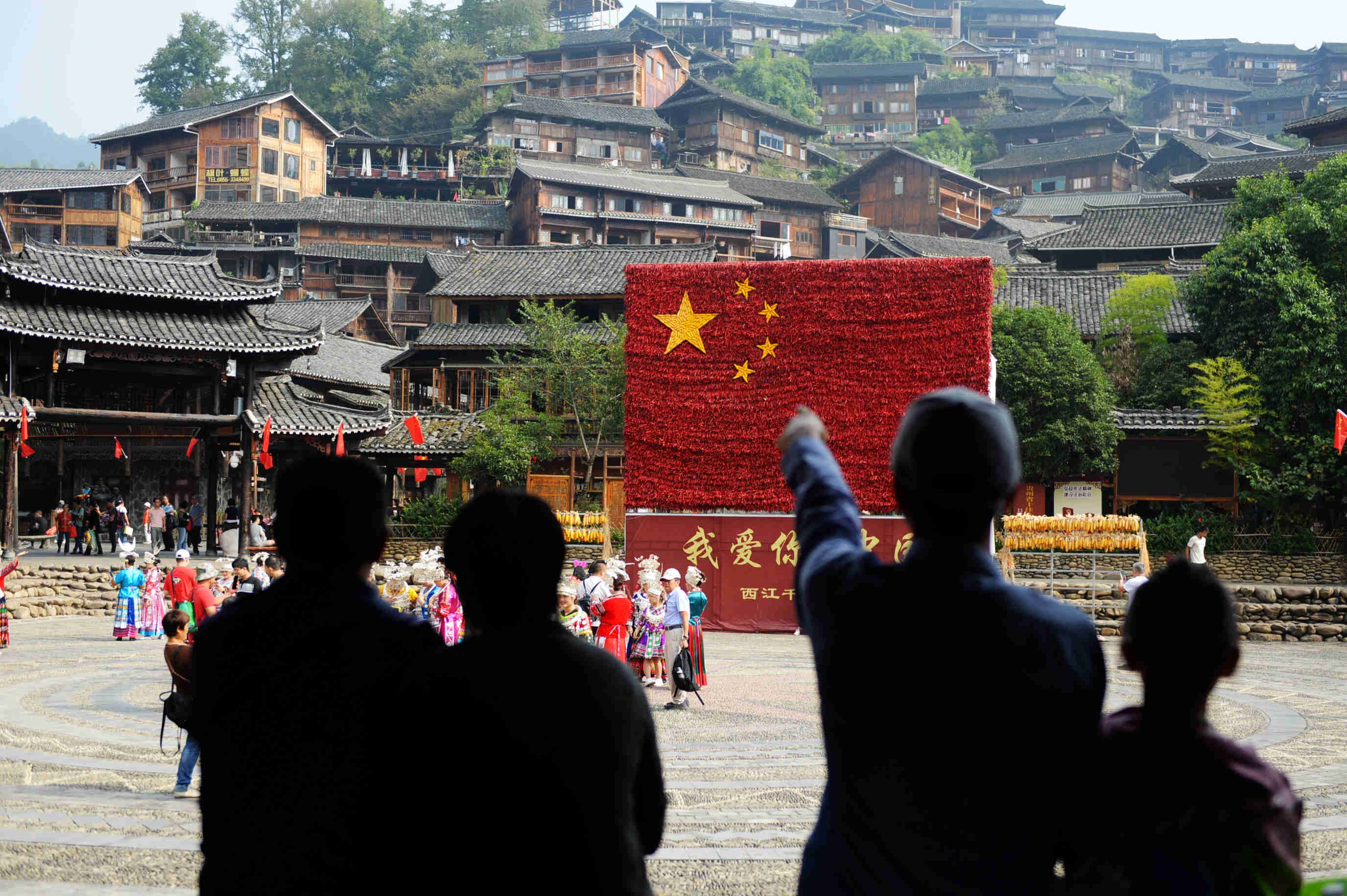 【香港商報網訊】「十一」黃金周期間,貴州雷山西江千戶苗寨內的中心蘆笙廣場上一幅巨大的國旗頻頻亮相,吸引前來的省內外遊客紛紛走到紅旗下拍照留影,祝福對祖國的繁榮富強、人民生活紅紅火火。