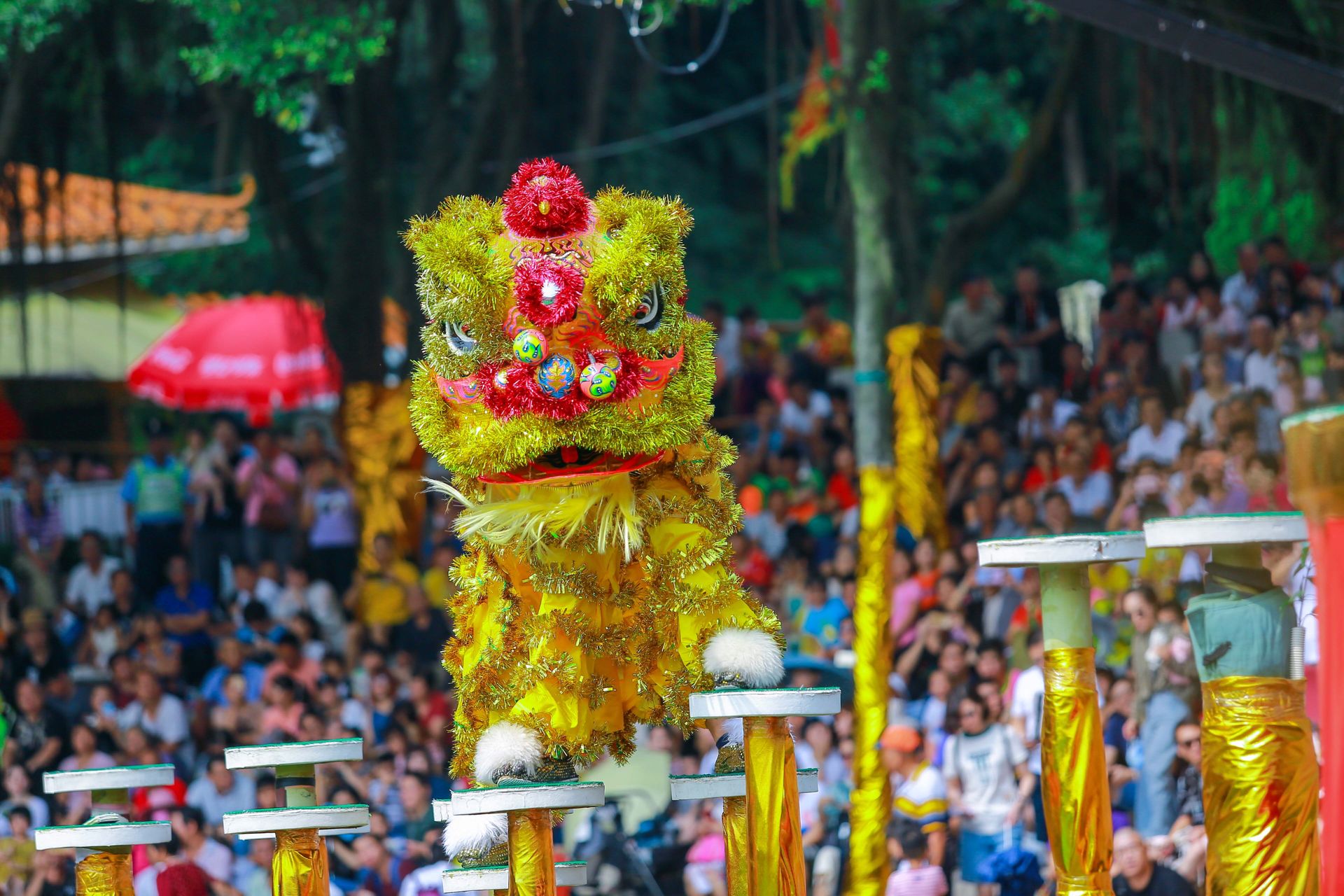 比賽中的高樁獅正在高柱上閃轉騰挪