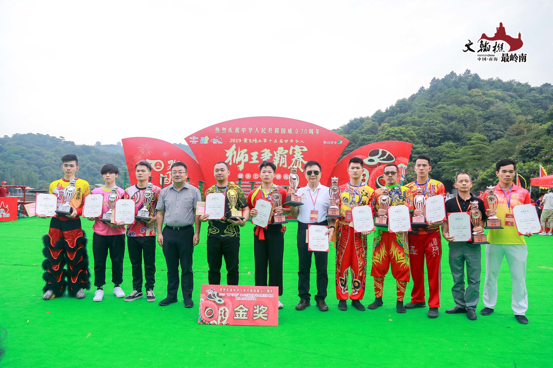 經過兩日的激烈角逐,第十五屆世界華人獅王爭霸賽圓滿落幕。深圳市寶安區西鄉蚝業黃連勝醒獅團獲高樁南獅金獎,東莞石排明德醒獅團和重慶銅梁舞龍隊分別獲得水上飛獅和舞龍金獎,南海區國鼎武術龍獅團和南海西樵睿高廣場龍獅團分別獲得障礙南獅和競速南獅金獎。6日2019「黃飛鴻杯」第十五屆世界華人獅王爭霸賽暨水上雙獅挑戰賽在西樵山天湖公園圓滿落幕。