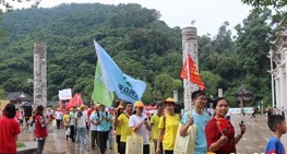 上午9時左右,隨着登山槍聲的響起,登山愛好者有序排隊登山。他們高舉彩旗、興緻高昂,攜手向著羊台山頂邁開步伐。