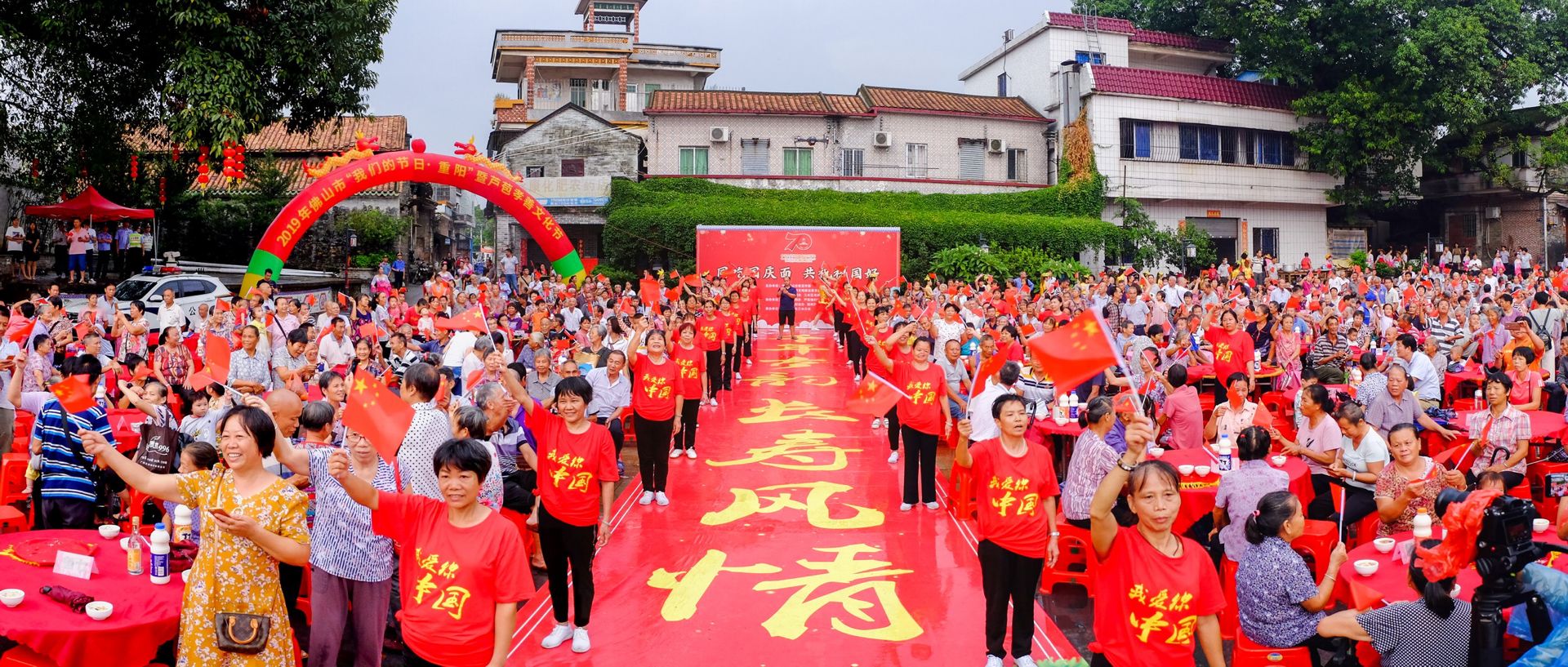 在三水區獨樹崗村的宴席上放着直徑超過1米的大盤,裏面已經備好了熱氣騰騰的「國慶面」。活動以「同吃國慶面,共祝祖國好」開場,千叟宴會上長壽老人歡聚一堂,共話敬老孝老的傳統。隨後活動以歌舞表演的形式,慶祝中華人民共和國成立70周年。現場還舉行了孝善蘆苞人命名儀式、蘆苞孝善聯盟宣誓、年代時裝秀等精彩特色活動。