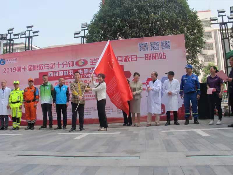 活動中,邵陽市紅十字會秘書長楊大慶為邵陽市中醫醫院院長寧美華授旗。寧美華在宣讀“急救白金十分鐘——全國自救互救活動日”倡議書時表示,掌握正確的救治方法,在傷病到來之時,就有可能挽救他人的生命,創造生命的奇跡,並呼籲市民們參與到自救互救的學習實踐中來。