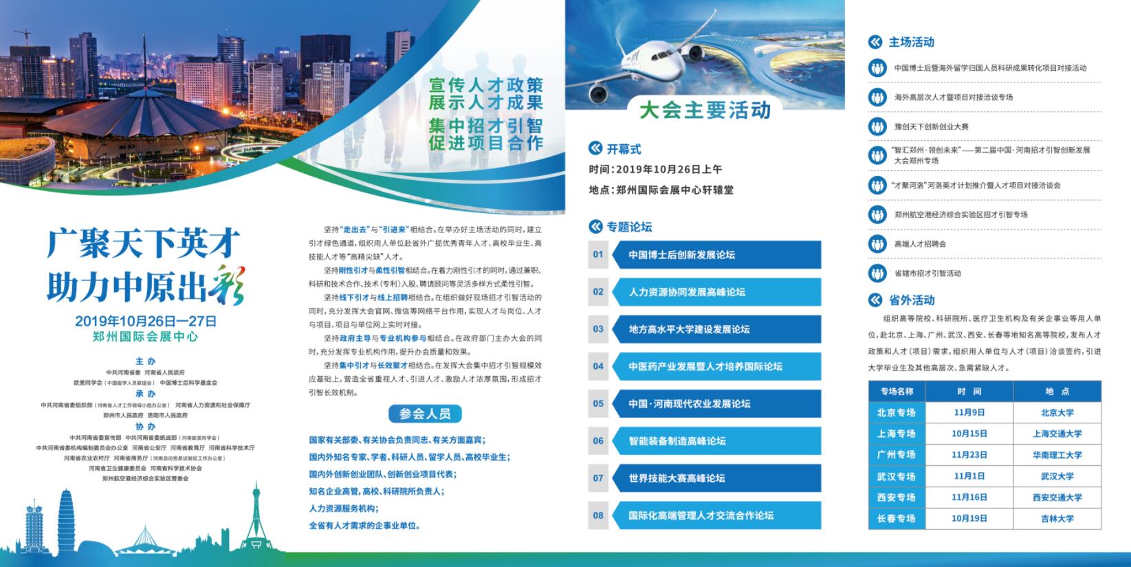 大會將於10月26日—28日分別在鄭州舉辦8場專題論壇活動、8場主場活動以及在10月至11月期間組織用人單位分赴省外知名高校招才引智,主要有6場活動。