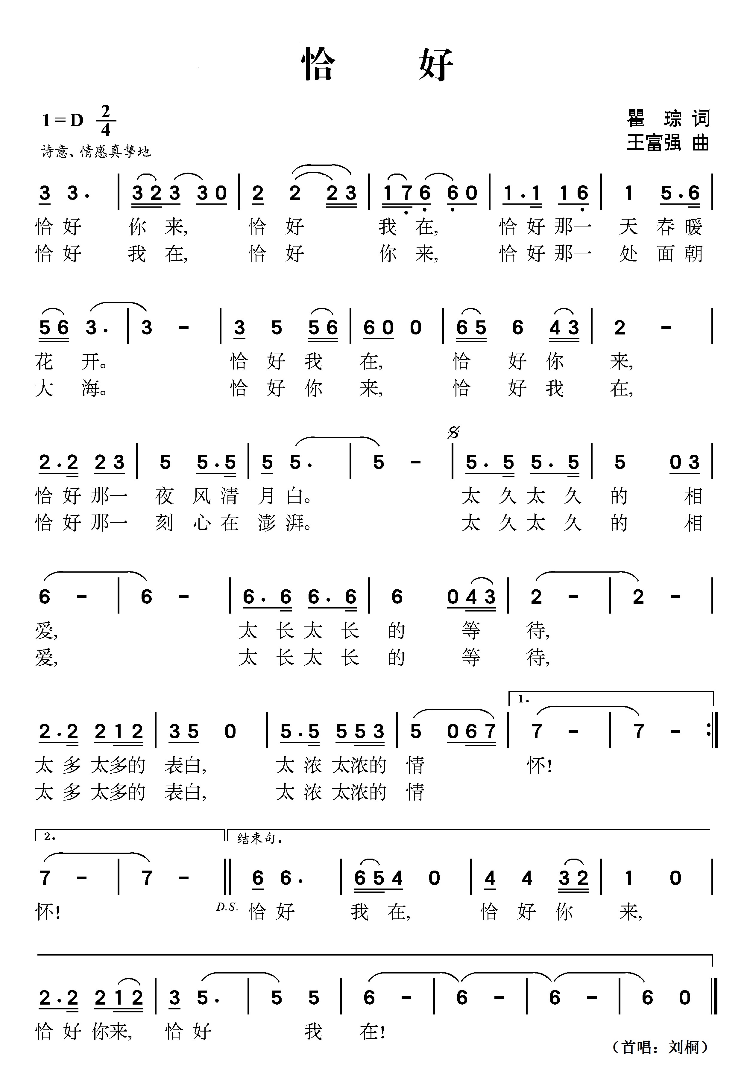 「『恰好我在,恰好你來……』讀到瞿老師這首歌詞,一個引人入勝的意境和令人陶醉的畫面立即呈現在眼前,音樂油然而起,面朝大海、春暖花開的整體音樂氛圍綻放而出,引人共鳴,令人陶醉。正在覓尋這首歌的首唱者的時候,恰好,劉桐出現了……」王富強老師微笑着告訴記者。「那天,我正在拉薩解放軍某部採風,接到劉桐的電話和用微信發來的清唱小樣,劉桐告訴說《駱駝之歌》和《恰好》她都超喜歡,並準備一次性將兩首歌展示出來。成品出來,一聽,比預想的還好。如此恰好!」王老師向記者介紹道,劉桐是 「一帶一路」北京宣傳大使和「綠色中國行」的宣傳大使,中國音樂家協會會員,先後獲得過首屆中國聲樂群英會金獎、第三屆「夢想中國」中國聲樂比賽金獎、第三屆中國民族聲樂「敦煌獎」金獎、第九屆中國聲樂「金鐘獎」民族組北京賽區銀獎、第十屆香港世界聲樂「金紫荊花」獎金獎。代表作有《媽媽的味道》《駱駝之歌》《恰好》《媽媽的味道》等。