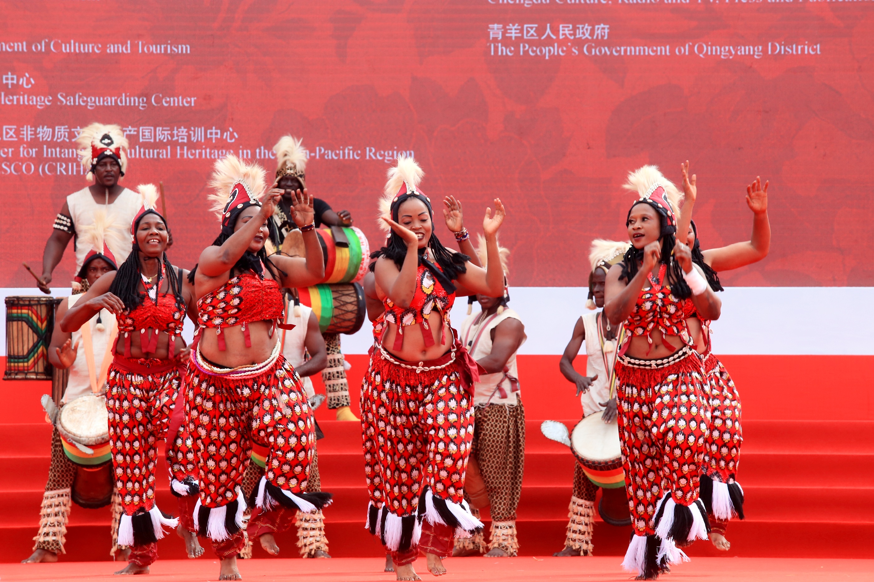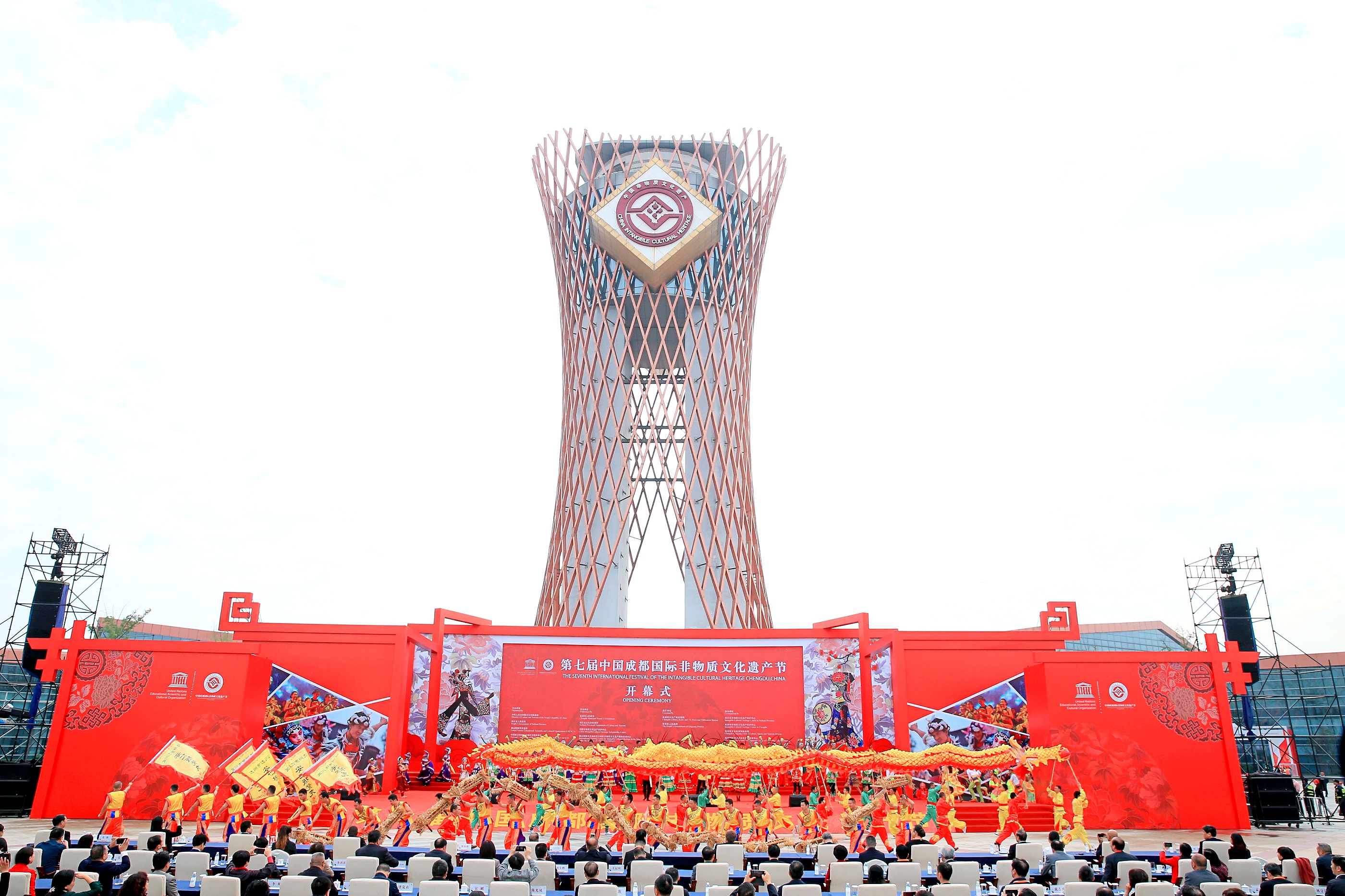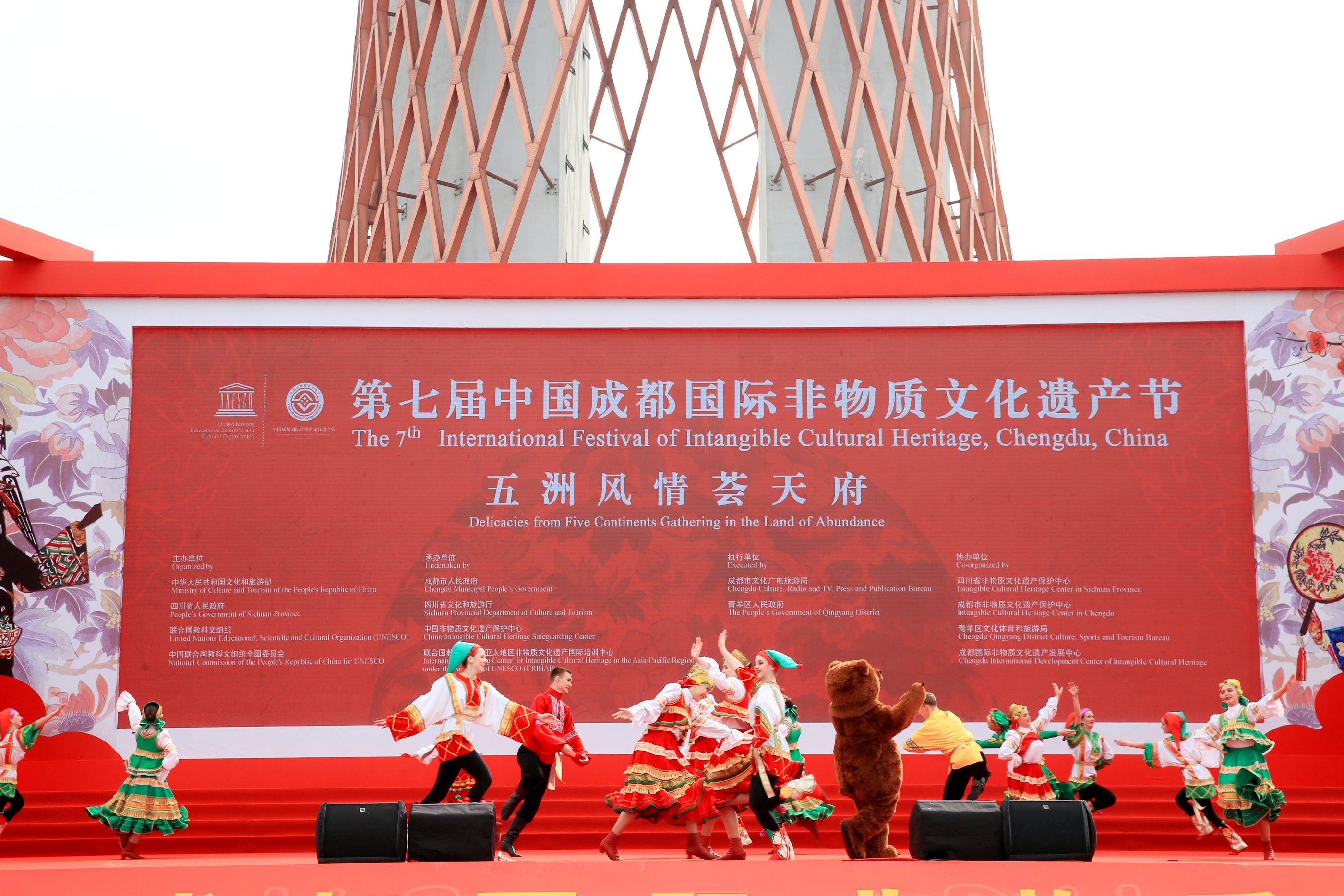 火辣熱情的夏威夷草裙舞、雄壯激越的蘭州太平鼓、氣勢恢宏的瀘州雨壇彩龍……開幕式演出以《五洲風情薈天府》為主題,來自國內外40餘支隊伍,通過「世界風、中國韻、天府情」三個版塊,為現場3000餘名觀眾奉獻了一場世界級非遺盛宴。非遺節期間,來自全球21個國家的64支國內外演出隊伍將輪番登場,全方位多角度展現世界非遺魅力。