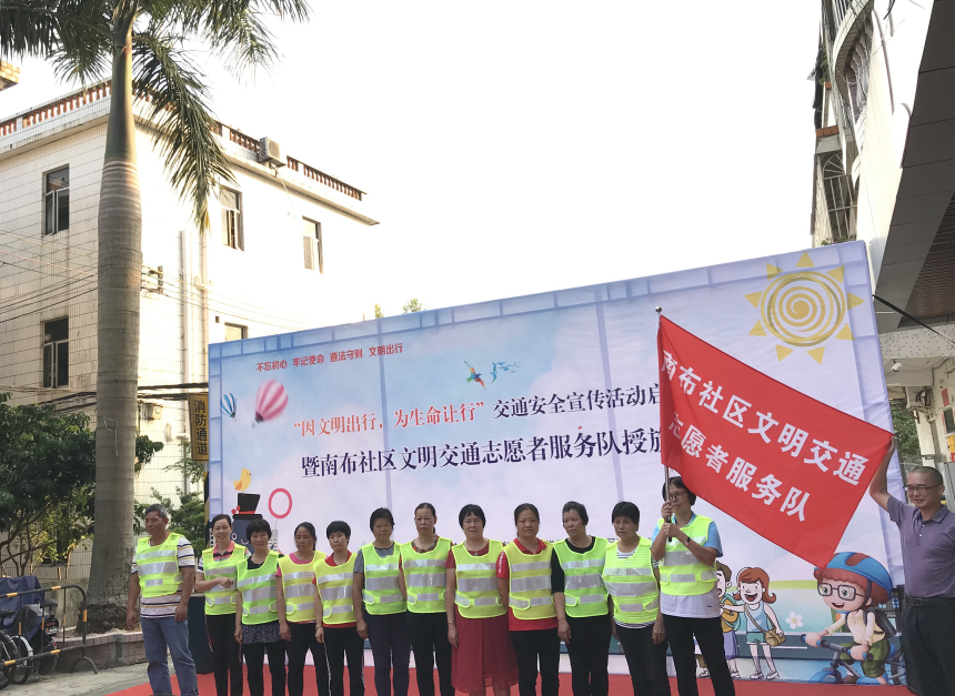 南布社區黨委副書記向「南布社區文明交通」志願者服務隊授旗,志願者代表面向社區居民進行宣誓。坪山交警大隊宣傳民警、街道交安辦工作人員為社區居民示範安全頭盔的佩戴,強調「頭盔是個寶,出門要戴好」,叮囑家長必須為兒童佩戴兒童頭盔方可出行。