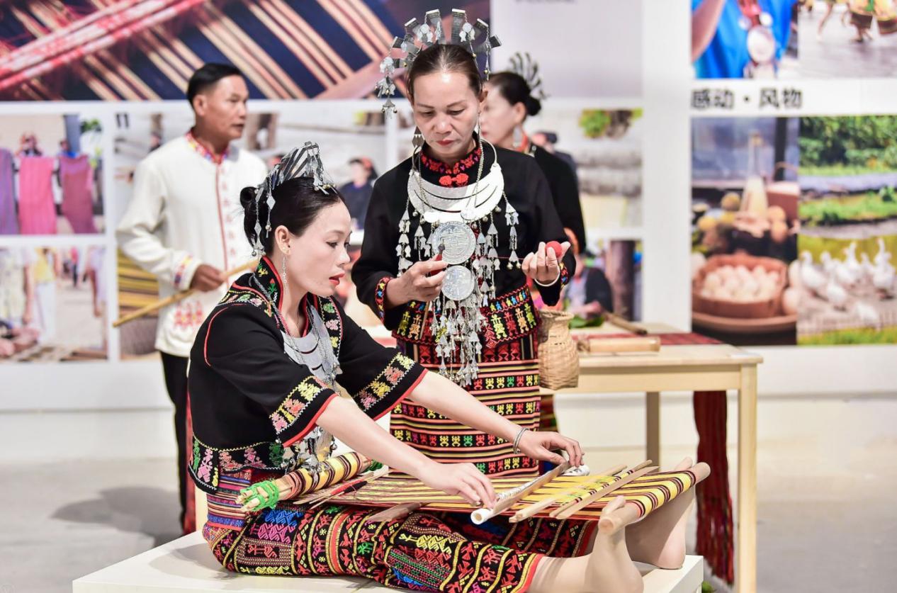 來自海南三亞中廖村的黎族婦女在現場演示黎錦的織造工藝