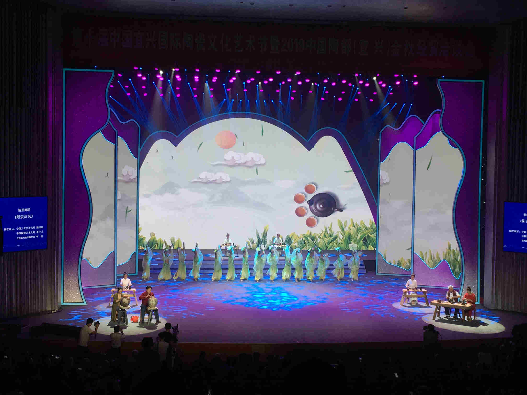開幕式現場,中國工藝美術大師顧紹培現場表演國家級非物質文化遺產——紫砂陶製作技藝。中國陶瓷藝術大師李守才和宜興優秀青年陶藝家李倩現場表演均陶大拇指堆花工藝。