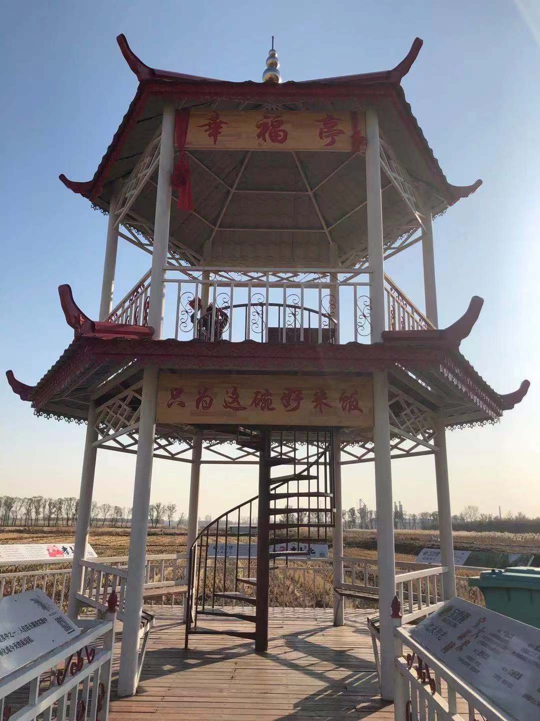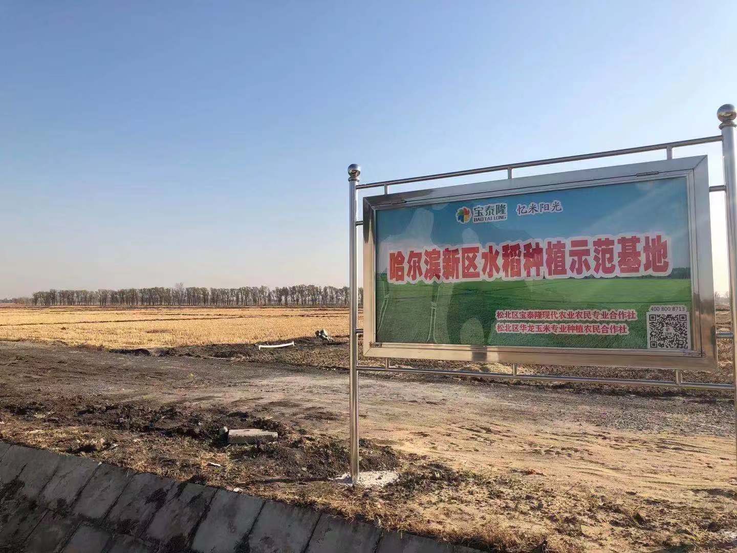 在來到另一處杏花村基地的路上,一個碩大的寫着「只為這碗好米飯的」的廣告牌矗立在已經收割完成的水稻基地旁,好像在印證這句話的真實性。到了杏花村基地,記者一下車就看到了寫有「哈爾濱新區水稻種植示範基地」的牌子,另一邊是寫着「我們是黑土地的守護者」的插畫,向遠處看一個寫着「只為這碗好米飯」的「幸福亭」屹立在一望無際的水稻田中間,別有風味。在記者眼裡已經很整齊劃一的稻田地,在李鳳蘭的眼裡卻還是不滿意,她說,「明年我還要弄得更加板正。」