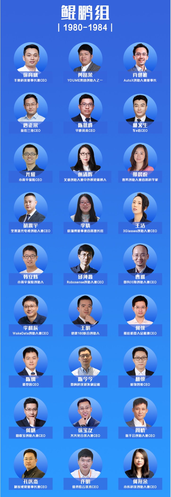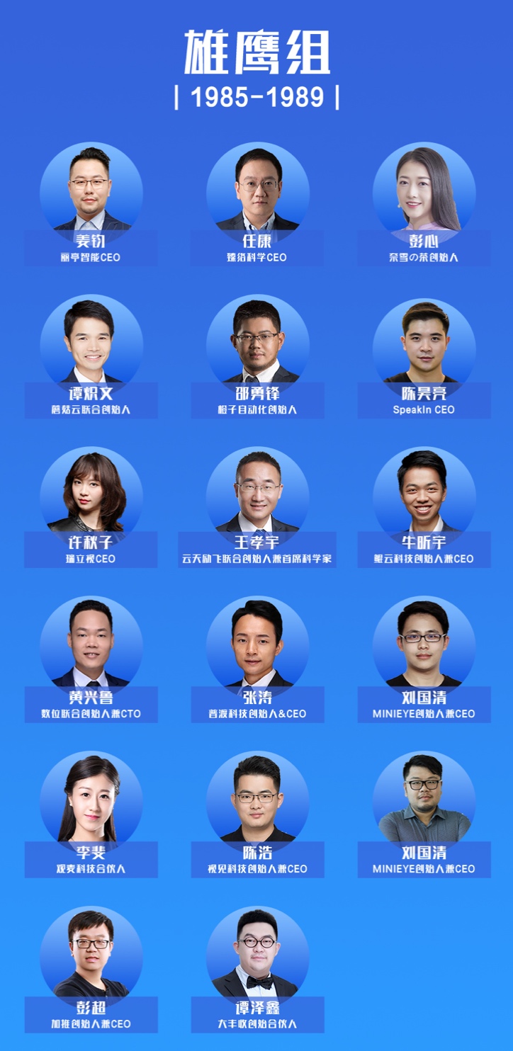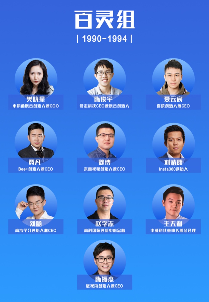 本次榜單分別選取1980年-1984年、1985年-1989年、1990年-1994年這三個年齡區間的青年創業者,分為鯤鵬組、雄鷹組、百靈組三大組,依次選出27名、17名、10名青年創業者,總計54人(諧音五四青年)。名單見附圖。