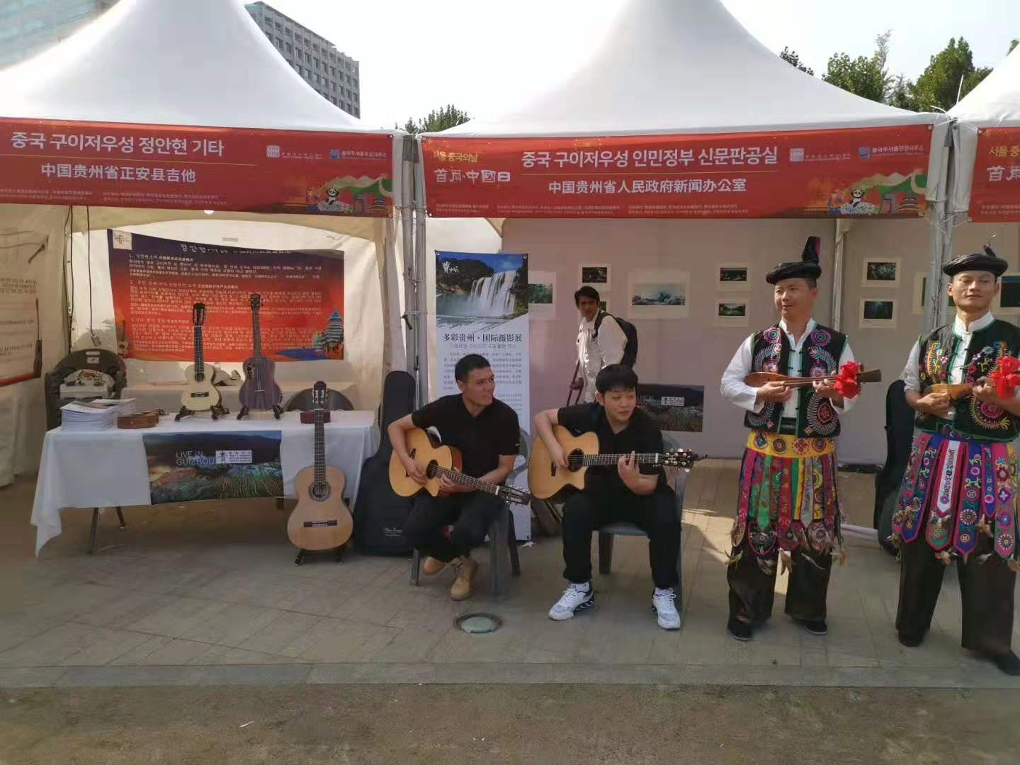 廣場外側,眾多中資機構、企業以及友好團隊搭起60多頂帳篷,向當地市民展示中國社會經濟發展成就和文化旅遊資源。其中,貴州設有8個展位,集中展示了貴州茶、文旅非遺和正安吉他。 在黔茶展位,茶藝師用中國傳統茶藝沖泡貴州優質綠茶、紅茶,吸引眾多韓國民眾爭相品嘗;在非物質文化遺產展位,苗族蠟染、苗族銀飾鍛造傳承人現場展示,精湛的非遺技藝征服現場觀眾;在吉他展位,產自遵義市正安縣的多把名品吉他亮相,「中國吉他製造之鄉」形象深入韓國人心。