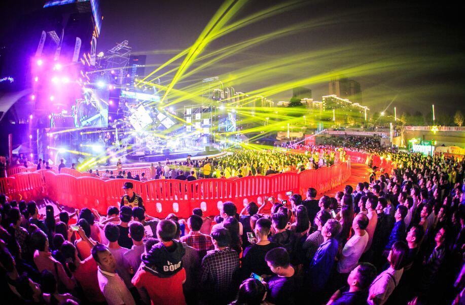 夜晚音樂節現場的炫目燈光和如織人群融為一體