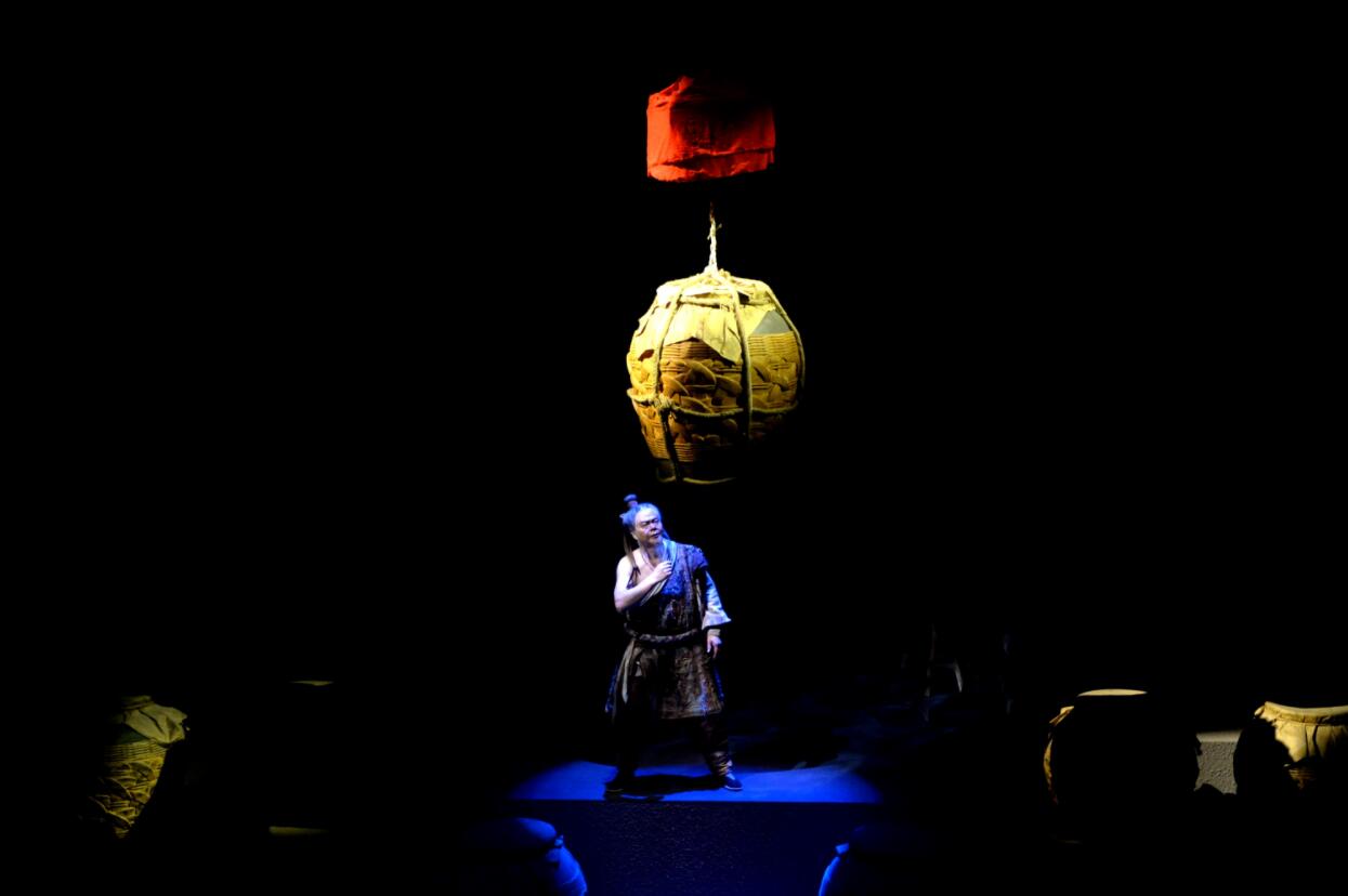 B廳可說是唯美至極的一個表演廳,階梯教室般搭建的一《天釀》排排整齊劃一的酒罈陣,主人翁酉酉端坐在立於中心的巨大酒罈之上,整個酒罈陣通過紗幕投影呈現真人與全息影像的互動表演,並配合酒罈陣上的結構投影與投射下來的光陣明暗變化,巧妙呈現時間的流逝、主角內心的雲涌變化以及茅台酒最終勾兌成「天釀」的過程。