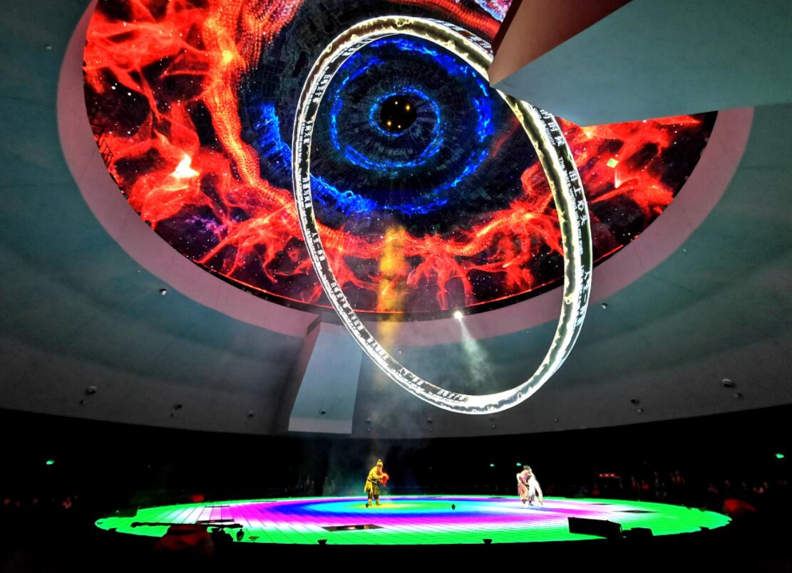 進入序廳,首先映入眼帘的是無限的視野空間。劇情上從天地人,到萬物生長,至天啟酒源,為呈現天地大氣的空間視覺,整個序廳由360度環屏、蚊香頂屏、數塊開合屏、地屏、地側環屏及可變形彈力紗幕和各種升降台、威壓吊點、燈光設備等組成,營造無限的視野空間。
