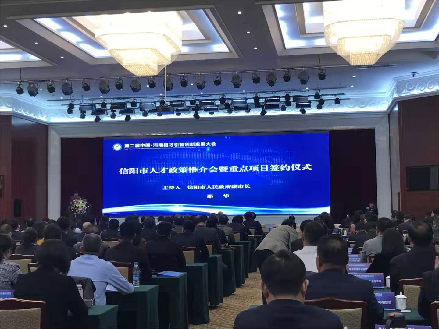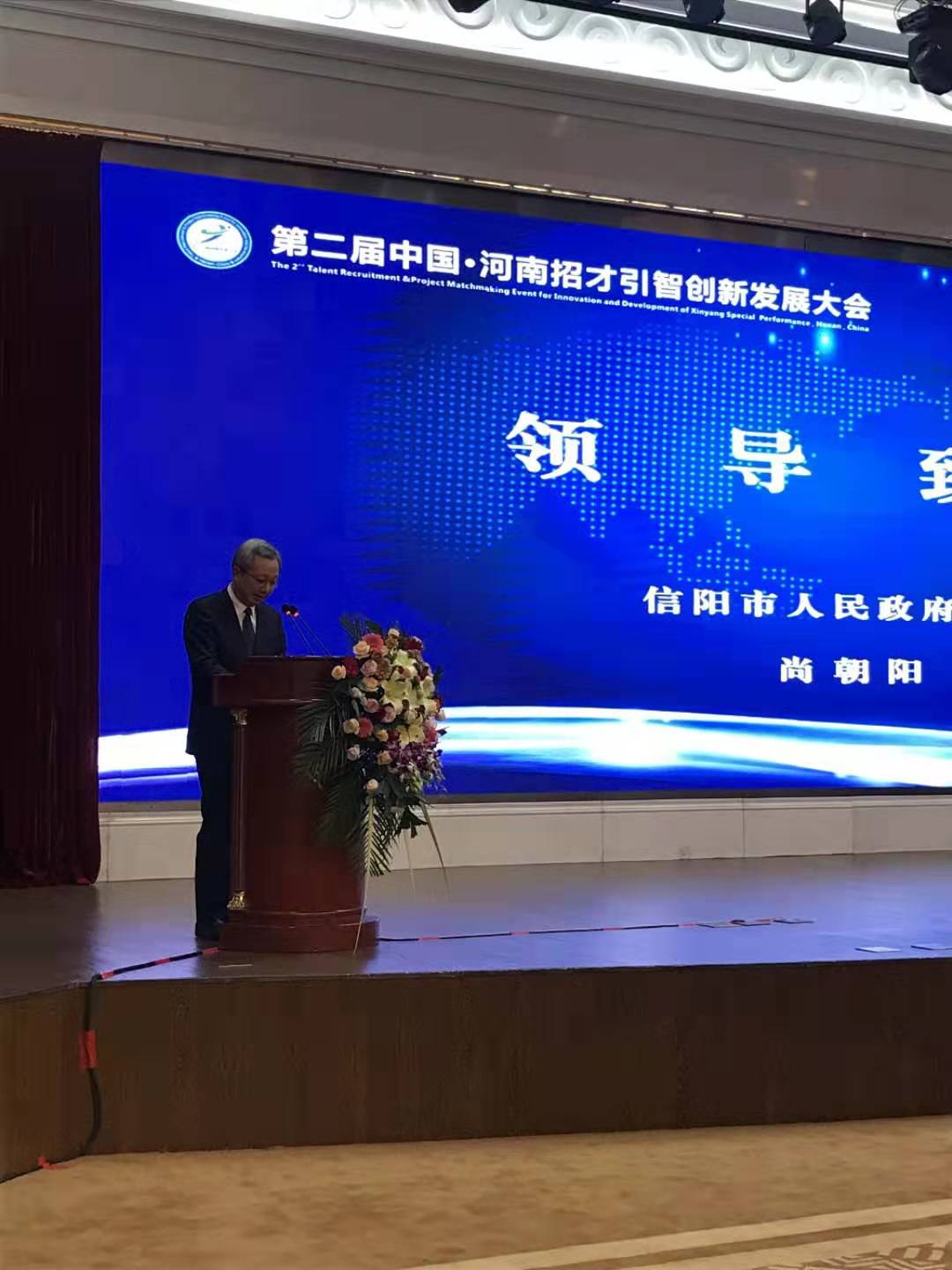 信陽市委副書記、市長尚朝陽出席活動並致辭,他首先介紹了信陽市在首屆「中國·河南招才引智創新發展大會」上取得的成果。他說,今年以來,信陽市已對首批「信陽英才計劃」入選對象資助資金1050萬元。目前,信陽建成國家級科技創新平台載體11家,省級創新平台載體106家, 2018年獲省級科技進步獎6項;申請專利3344件,授權專利1755件,這些都為各類人才創新創業搭建了優質平台,營造了廣闊空間。