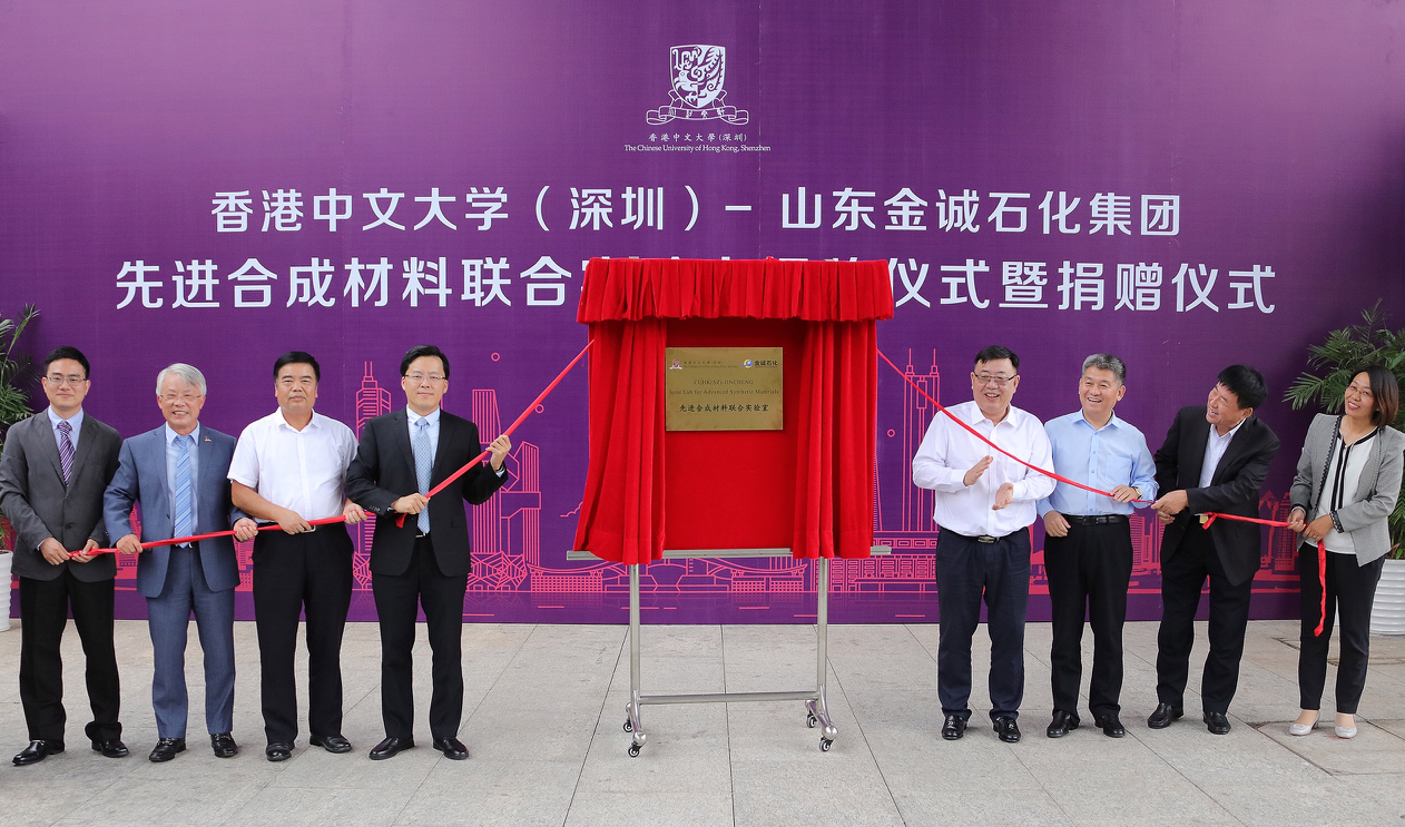 郭秀學女士介紹了金誠石化集團公司的發展規劃及人才需求,王果先生介紹了香港中文大學(深圳)聚合物產品工程研究院籌備工作,並在專家們的見證下, 淄博市委常委副市長楊洪濤、深圳市政府副秘書長李卓文、桓台縣縣委書記賈剛、龍崗區副區長陳廣文、金誠集團董事長周敬才、港中大(深圳)副校長朱世平、金誠研究院副院長郭秀學及聯合實驗室副主任王果為「香港中文大學(深圳)—山東金誠石化集團先進合成材料聯合實驗室」揭牌。