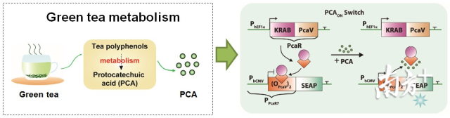 綠茶在人體內的代謝產物之一是原兒茶酸(PCA)。該課題組巧妙地設計合成了一套原兒茶酸調控的轉基因表達控制系統,並將其安裝進細胞裏,讓細胞智能化。當這種細胞被植入人體後,人們只需通過飲用定制濃縮綠茶,就可以啟動細胞中特定基因的表達。這種細胞可以按需定制。植入這種智慧化細胞後,人們就可以通過飲用綠茶,在體內生產特定基因編碼的蛋白藥物,例如胰島素等。