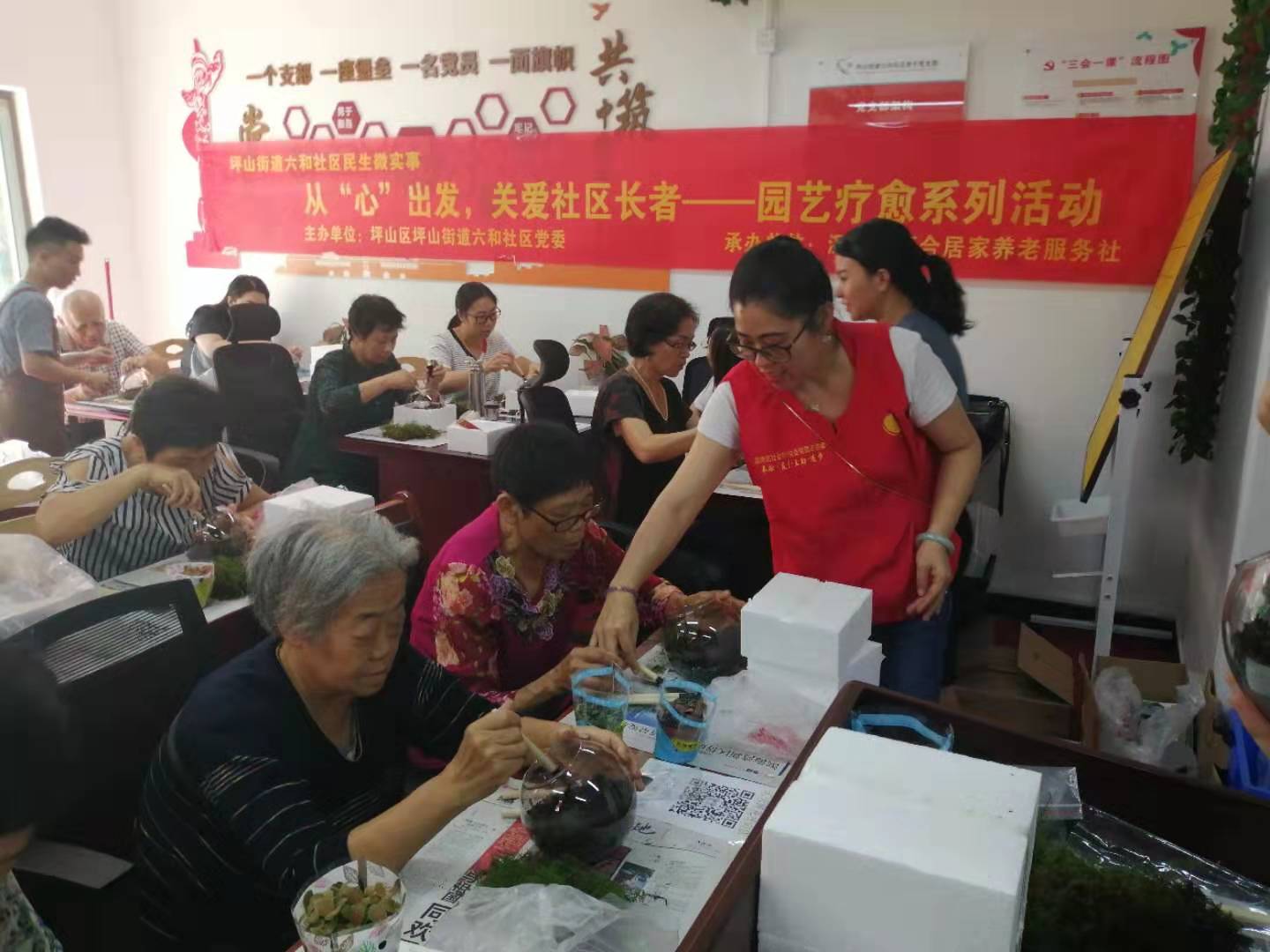 為更好發揮黨群服務站陣地作用,坪山街道在摸清老黨員人數、基本情況的前提下,成立花園小區老乾黨支部,完成支委班子選舉,並在花園小區黨群服務站設立「老乾黨支部活動室」、「老年大學」、「長者休閑室」。長者休閑室提供棋牌、圖書借閱、兒童遊樂等服務;老年大學為老年人提供公益課程,於每周六、周日常態化開設葫蘆絲、象棋、手工藝、經絡理論班等課程,目前服務達1500人次。在老乾黨支部的組織和老黨員同志的帶領下,花園小區老年朋友們積极參与「我是麥霸」、文明出行志願服務等黨群活動,在共同參與中提升自身精神面貌,傳遞社會正能量。