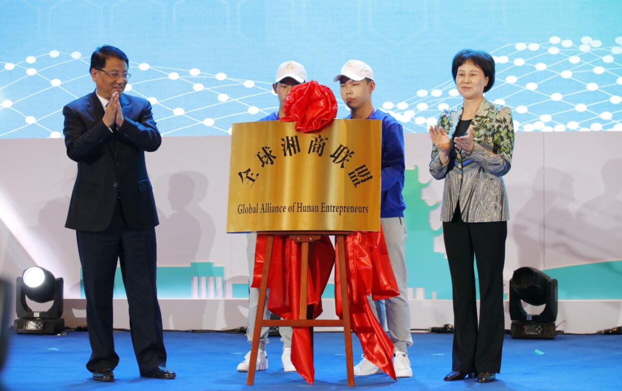 湖南省領導黃蘭香(右一)、黃關春(左一)為全球湘商聯盟揭牌