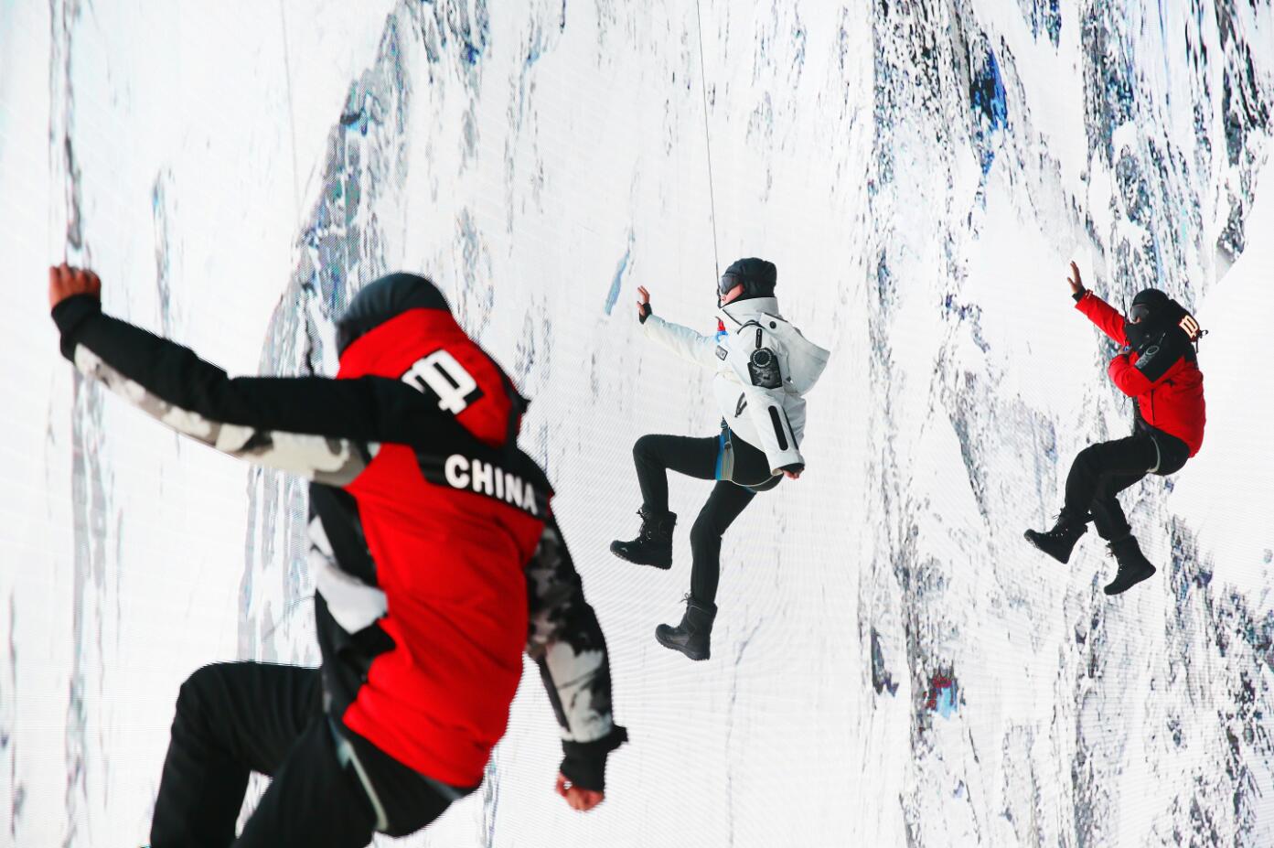 發佈會的走秀環節也充滿了科技感。配合著大屏幕上呈現的珠峰之景,四位專業模特身穿本次發佈會的主角——登峰系列羽絨服,吊著威亞從舞台上空緩緩降落。隨即又沿着雪山向上攀登,鏗鏘有力,步履堅定。直至攀爬到峰頂之後,四位模特速降到舞台中央,大屏上浮現出四款登峰系列服裝。