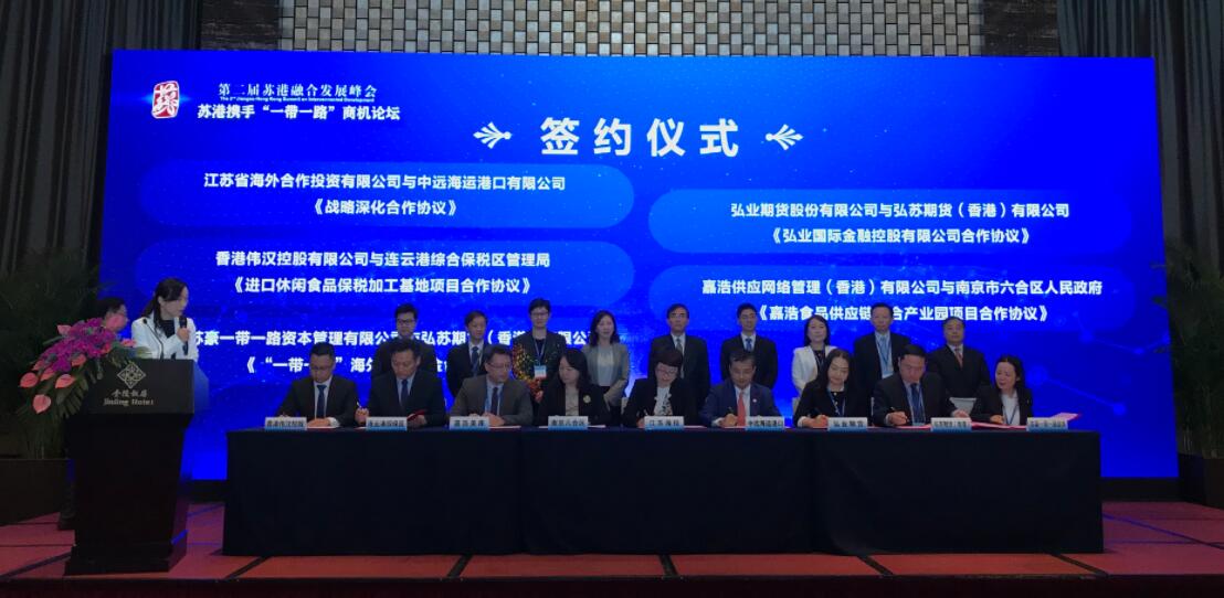 論壇期間,江蘇省海外合作投資有限公司與中遠海運港口有限公司戰略合作協議、連雲港綜合保稅區管理局與香港偉漢控股有限公司食品保稅加工基地項目、江蘇蘇豪一帶一路資本管理公司和弘蘇期貨、弘業期貨與弘蘇期貨以及嘉浩食品供應鏈五項蘇港合作項目完成簽約,簽約金額超20億元人民幣。(杜林 李愛)