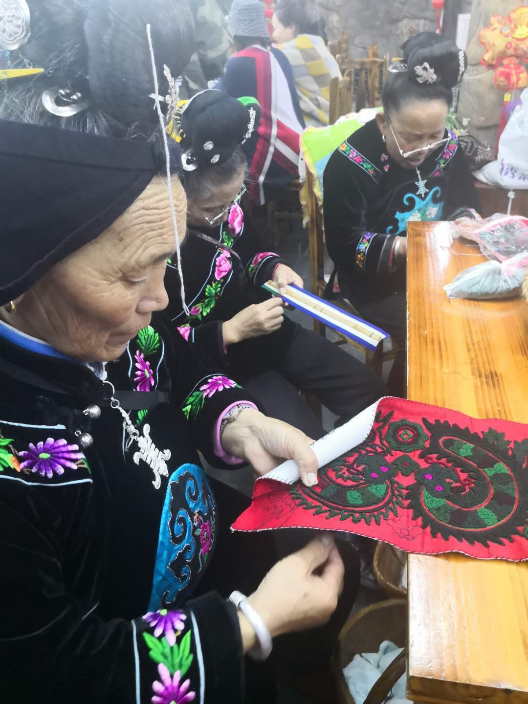 古巷裡的苗綉傳承基地中,數位六十多歲的苗族奶奶們在飛針走線,刺繡出各種美麗的綉品,還有許多遊客向她們學習刺繡技藝。苗綉是中國苗族婦女必須的服飾和刺繡品,具有獨特的民族風格和藝術技藝,以針法精巧,古秀文雅、色彩豐富而聞名省內外,花紋布置嚴密,色彩對比強烈,圖案花紋各種多樣。苗族刺繡構圖講究嚴謹、對稱、協調,每幅綉圖均有主、副圖案;構圖內容取材廣泛,天、地、人、神、植物、動物等無奇不有,且遠古、近現代風格均有。