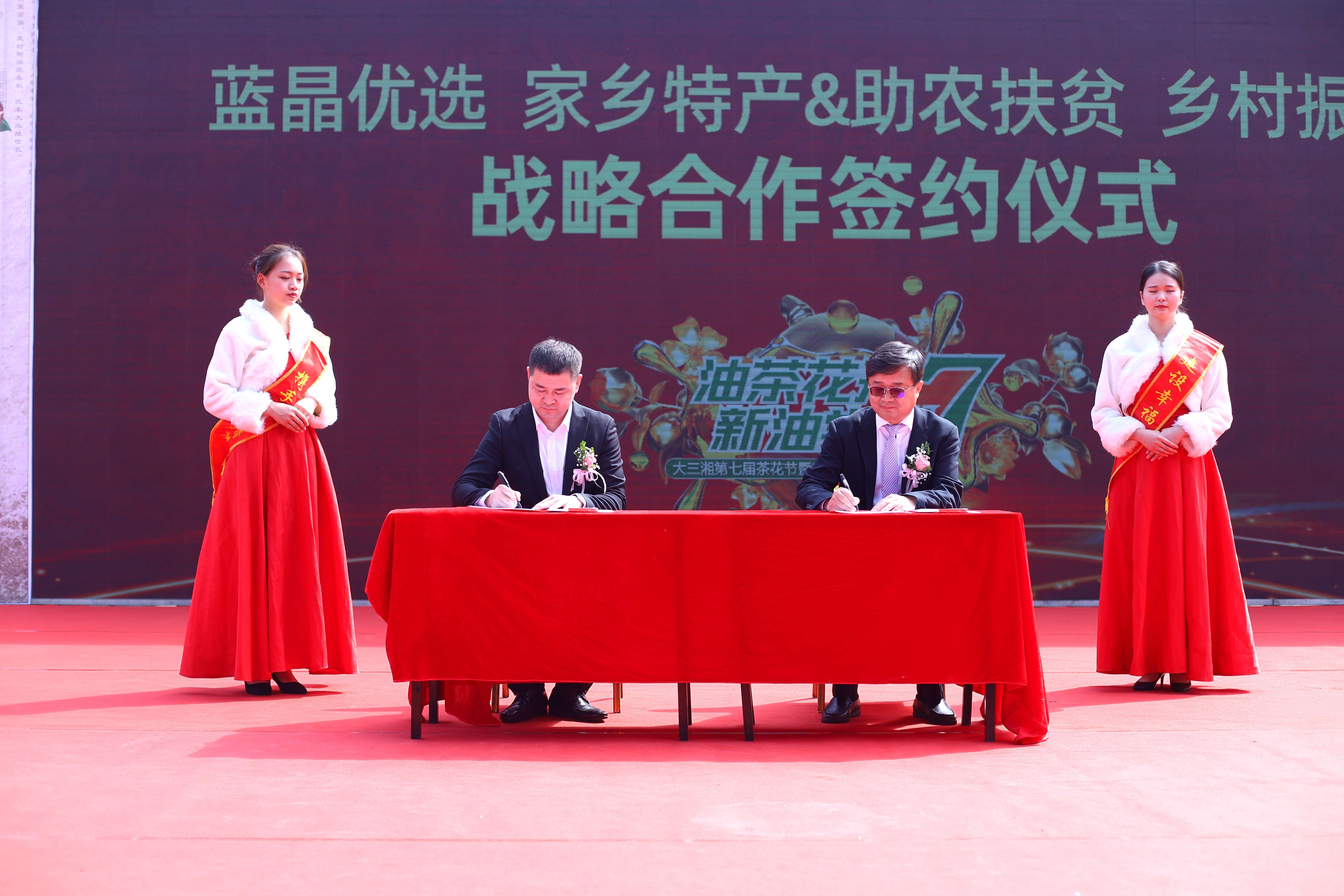 在當日的開幕式上,新一代社交電商平台藍晶社執行總裁石添與湖南大三湘茶油股份有限公司董事長周新平進行了「助農扶貧計劃」之助力湖南茶油鄉村振興項目簽約儀式。不久,消費者就可以在藍晶社平台上購買分享高品質的大三湘茶油。(周芷行 肖盛梅 徐殿坤)