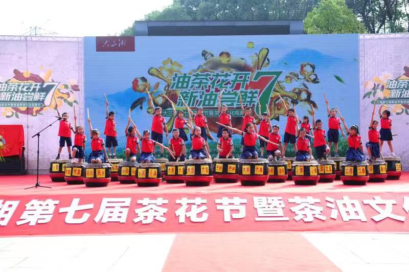 開幕式上,少年兒童用鼓聲表達對茶果豐收的喜悅之情