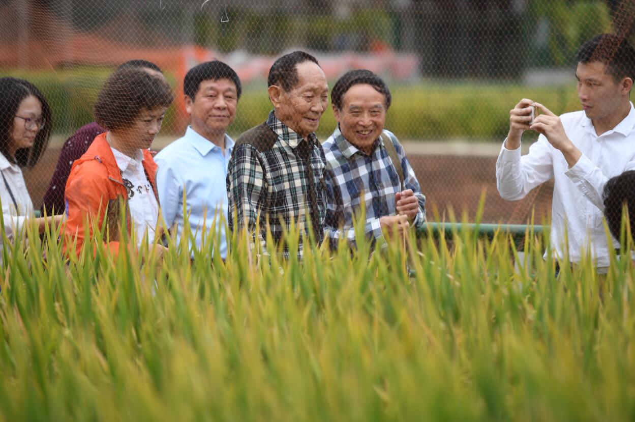 袁隆平在國家雜交水稻工程技術研究中心內的第三代雜交水稻試驗基地觀察稻穀長勢 (中新社 楊華峰 攝)