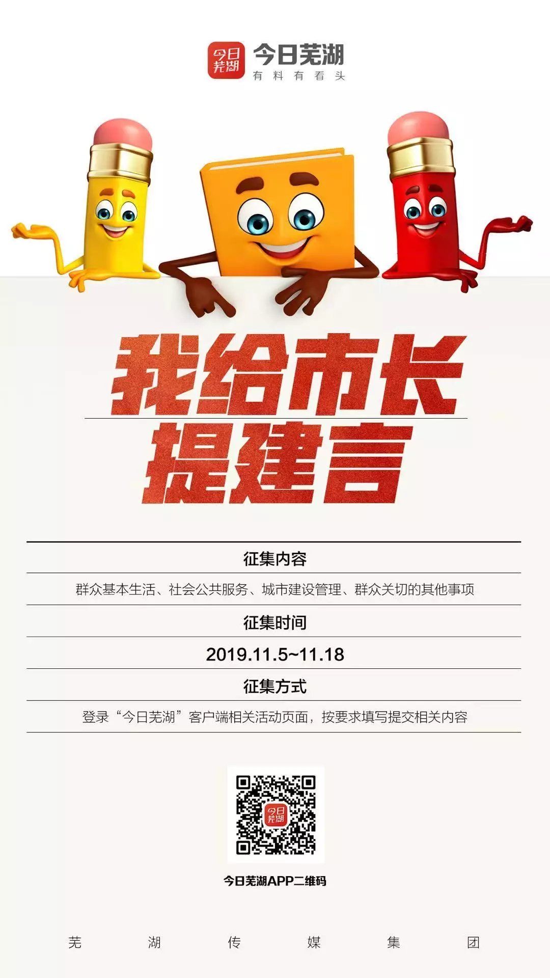 蕪湖市本次民意徵集活動時間為2019年11月5日至11月18日,徵集內容主要包括四個方面,即群眾基本生活(就業創業、社會保障、食品安全、住房保障、社會治安等)、社會公共服務(政務服務、教育文化、醫療衛生、養老健康、體育事業等)、城市建設管理(市政設施建設、環境保護治理、交通出行、園林綠化、老舊小區整治等)以及群眾關切的其他事項。