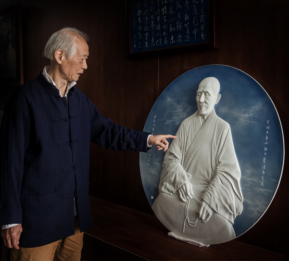 《瓷韻匠心》中的攝影作品:80歲的黃秀乾和他創作的虛雲老和尚的瓷雕(熊盛文 攝)