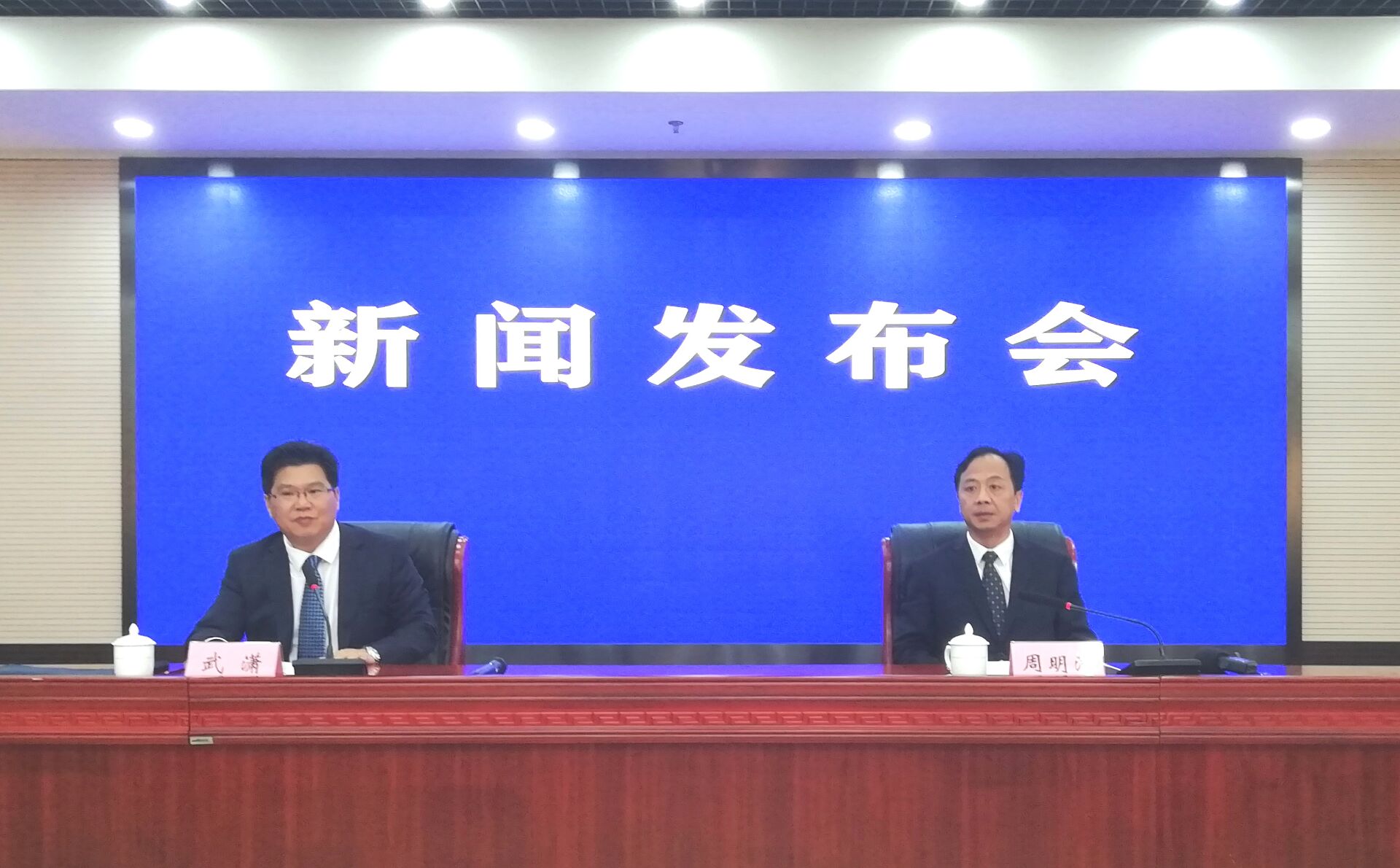 發佈會現場,左起,安徽省委宣傳部新聞發佈處處長武瀟主持,省文化和旅遊廳副廳長周明潔發佈並答記者問(孫軍/攝)