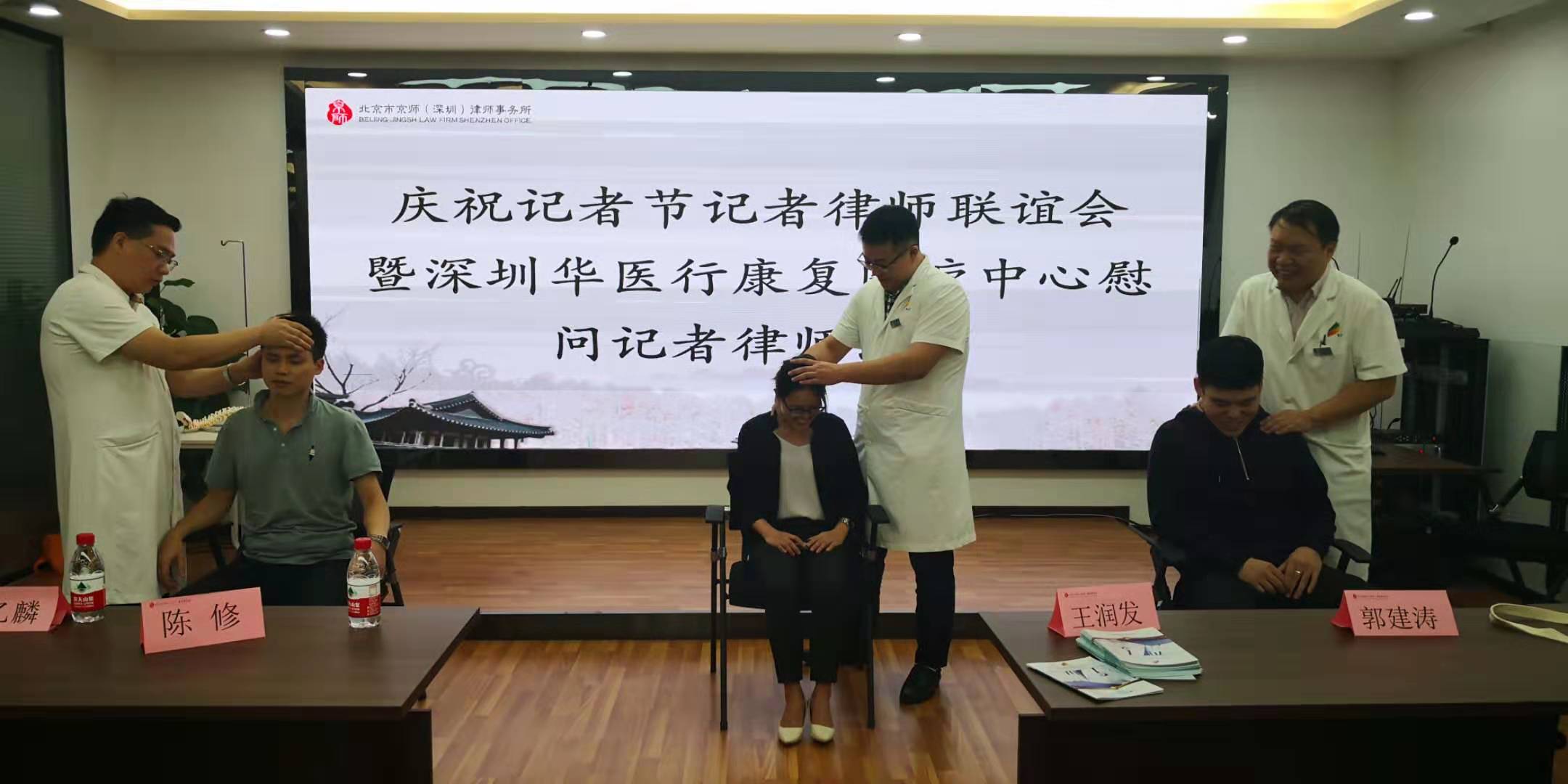 【香港商報網訊】記者 蘇偉 報導:11月7日下午,在記者節前夕,深圳華醫行康復醫療中心專業醫生來到深圳廣電集團文創中心的京師〈深圳)律師事務所慰問辛勞在一線的記錄和律師們。因為工作關係,記者律師長期伏案工作,患頸椎和肩周炎的較多。醫療中心的專業醫生對30多位記者和律師進了理療服務並講解了防護的專業知識,受到了記者和律師的歡迎。