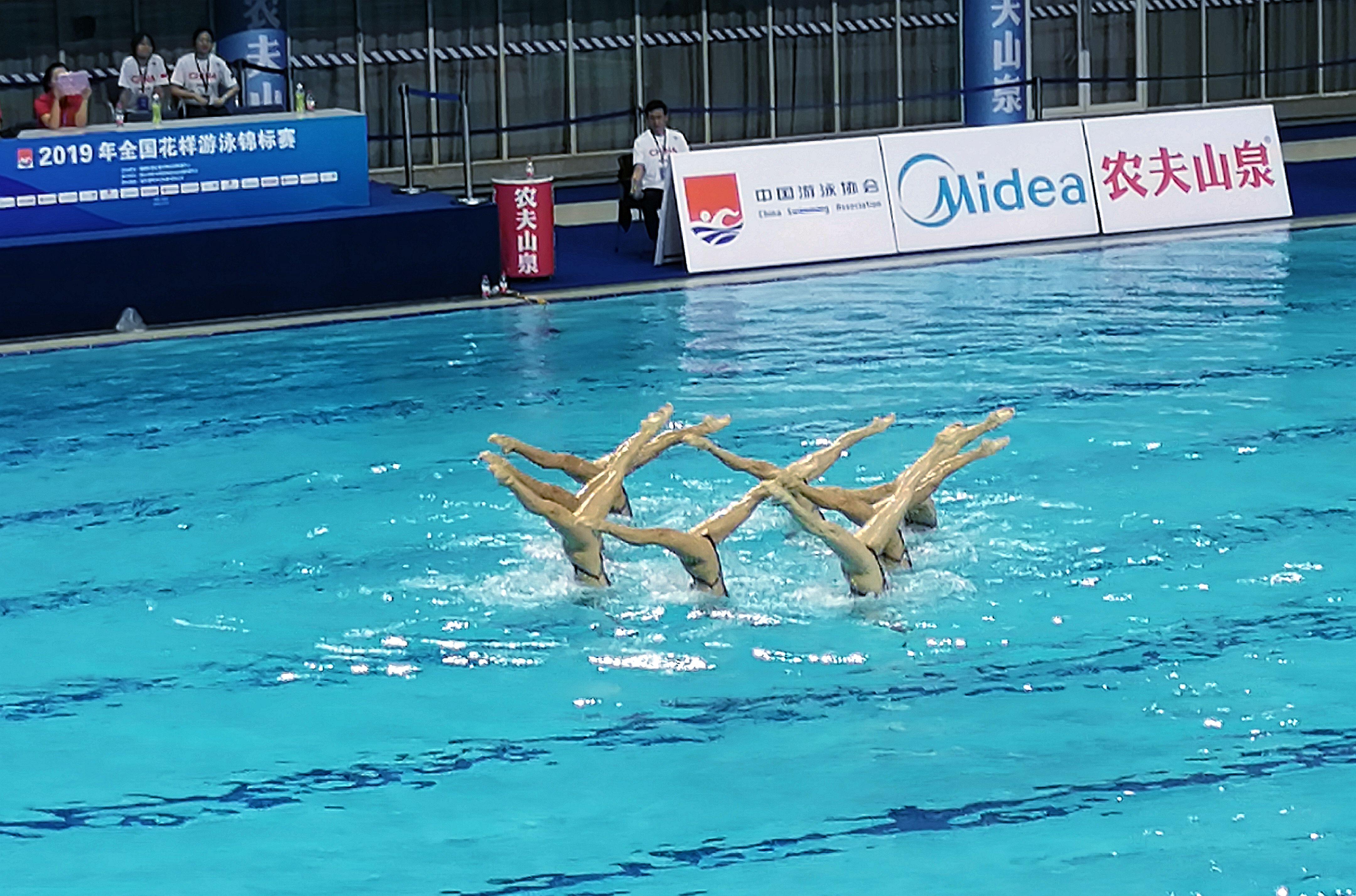 集體技術自選賽一共有9支隊伍參賽,津蘇鄂粵花樣游泳隊表現搶眼,在展現力量和技巧的同時,成功完成多組推舉、旋轉、彎曲等動作並以89.5765分拿到冠軍。(吳超群 張丙芬)