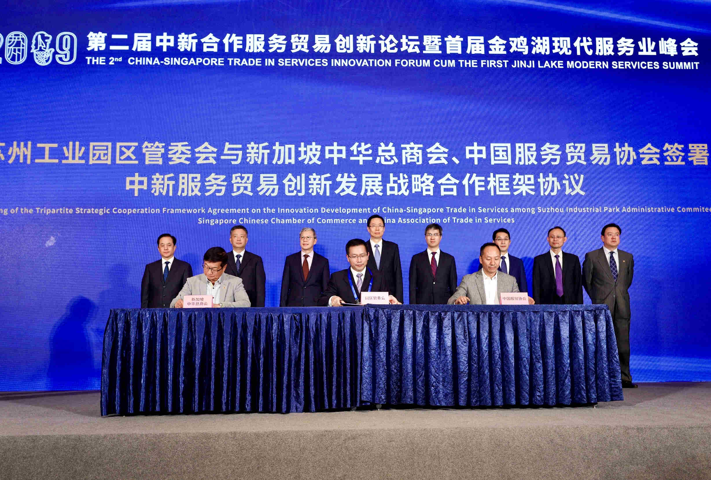 蘇州工業園區管理委員會與新加坡中華總商會、中國服務貿易協會在現場簽署中新服務貿易創新發展戰略合作框架協議