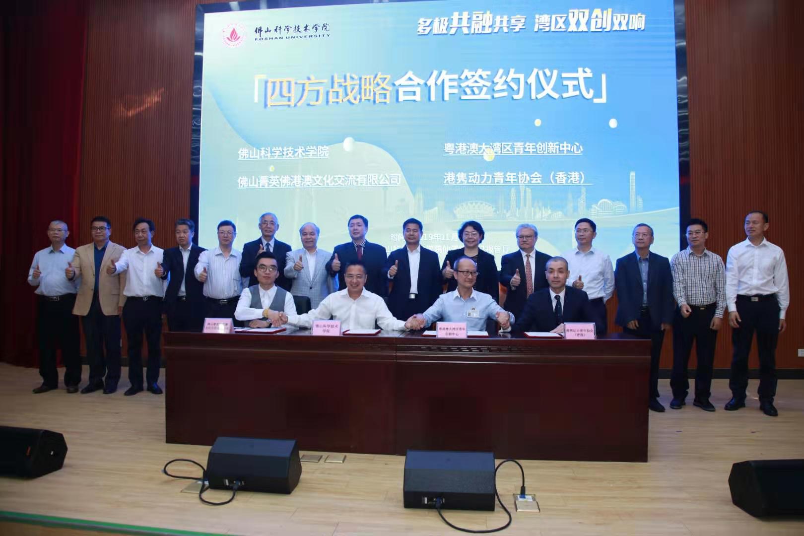 啟動儀式上,佛山科學技術學院、粵港澳大灣區青年創新創業聯盟(香港)、佛山菁英佛港澳文化交流有限公司、港雋動力青年協會(香港)的相關代表共同簽訂四方戰略合作協議,將在「共享粵港澳大灣區活動資源和成果」、「共建佛山對外招商引資平台」、「共建文化項目落地平台」、「共建商協會企業服務聯盟」、「提高人才培養質量以及建設大灣區產業發展智庫」等方面進行合作。
