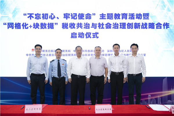 【香港商報網訊】記者 黃鳳鳴 報導:11月12日下午,「不忘初心、牢記使命」主題教育活動暨「網格化+塊數據」稅收共治與社會治理創新戰略合作啟動儀式在深圳市南山區稅務局舉辦。深圳市稅務局副局長李偉、深圳市委政法委員會副書記喬智、深圳市南山區區長黃湘岳出席了啟動儀式。