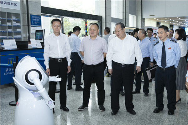 深圳市稅務局副局長李偉(左二)、深圳市委政法委員會副書記喬智(右二)、深圳市南山區區長黃湘岳(左一)參觀南山區稅務局辦稅服務廳