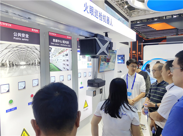記者在現場看到,一款銀黑配色、萌感十足的機械人沿着導軌,360度全方位監測着配電柜上的實時狀況。這場景吸引了不少觀眾和業內人士的目光。據了解,這款名為賽為火眼的巡檢機械人是賽為智能今年新研發升級的智能機械人產品,主要是應用在數據中心/機房、配電房、城市管廊和公共安全等領域。