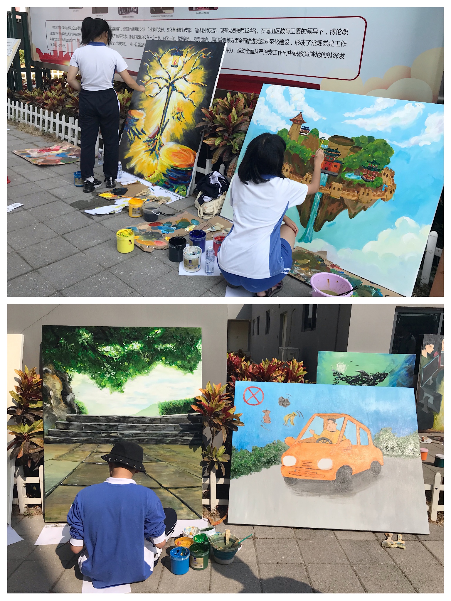 博倫職校分會場的藝術展廳外,美術專業學子畫畫