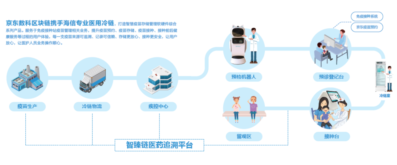 針對疫苗流通環節多、信息不透明、免疫終端庫存管理效率低、接種統計費時費力等痛點,京東數科以區塊鏈技術打通了疫苗的生產、冷鏈物流、疾控中心、接種站、疫苗的冷藏以及最終的接種、反饋等全流程環節,以數字化技術為消費者醫藥安全提供安全安心的服務,並幫助提高疫苗接種站的工作效率。